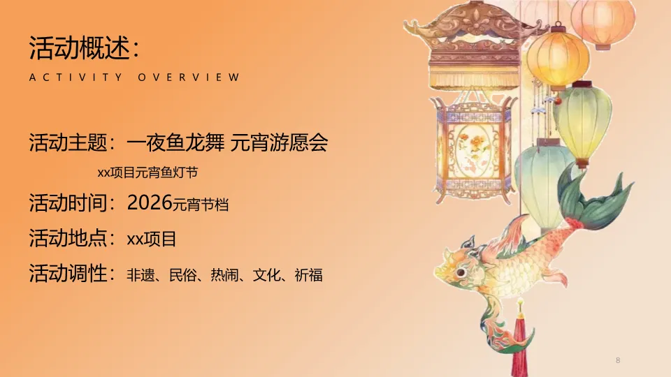 本方案为2026年商业地产元宵节非遗鱼灯主题营销活动的完整策划案。活动以“一夜鱼龙舞·元宵游愿会”为主题,旨在通过非遗文化赋能商业项目。方案核心围绕“鱼灯奇妙游”、“元宵鱼灯会”、“鱼灯夜游会”三大板块展开,设计了包含游园打卡、巨型灯景、汉服巡游、手作体验在内的丰富内容。方案不仅详细规划了活动创意与流程,更系统阐述了宣传执行、项目管理、安全预案等保障体系,为打造一场兼具文化内涵、互动体验与传播声量的节庆活动提供了可落地的范本。