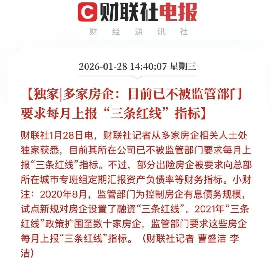 2026 年过了快1个月了,你是不是还在纠结:现在买房怕站岗,不买又怕错过 “抄底” 窗口?朋友圈里有人说 “房价还得跌”,中介又催 “政策红利快没了”,手里攥着存款的你,越看越焦虑 —— 到底这楼市,啥时候才能给个准信?就在1月28日,财联社一则独家报道让房地产圈彻底沸腾:多家房企(不管是国企、民企,还是正常经营的、出过险的)都证实,现在不用再每月给监管部门报 “三条红线” 指标了!这事儿看着是行业内部调整,其实跟咱们普通人买房息息相关 —— 今天老陈给你掰扯清楚:2026 年,房地产不是 “继续跌”,而是 “止跌回稳” 的一年,该放心的地方,咱别瞎慌!先搞懂:“三条红线” 不按月报,到底意味着啥?