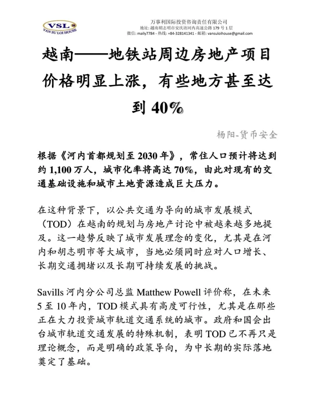 >越南地铁站周边房地产项目价格明显上涨,有些地方甚至达到40%