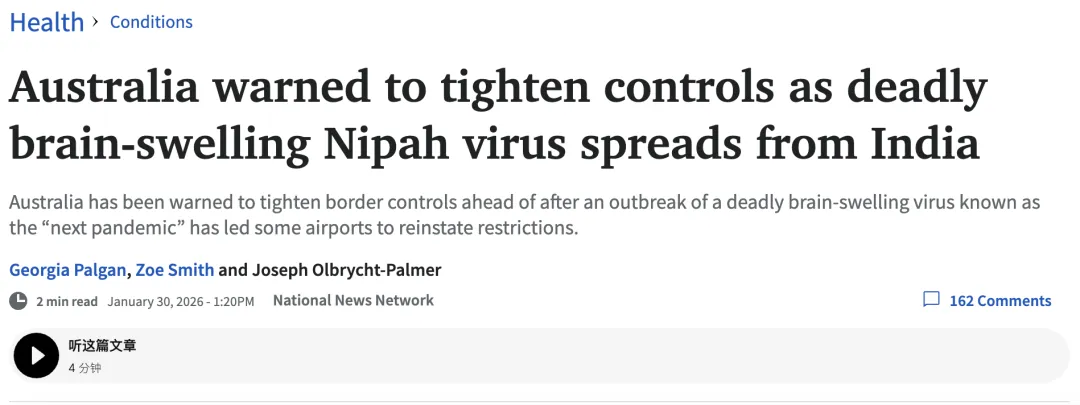 澳洲联邦卫生部长Mark Butler表示:“尼帕病毒非常罕见,但也极其致命。印度当局表示疫情已得到控制,但我们仍在非常密切地监测。”