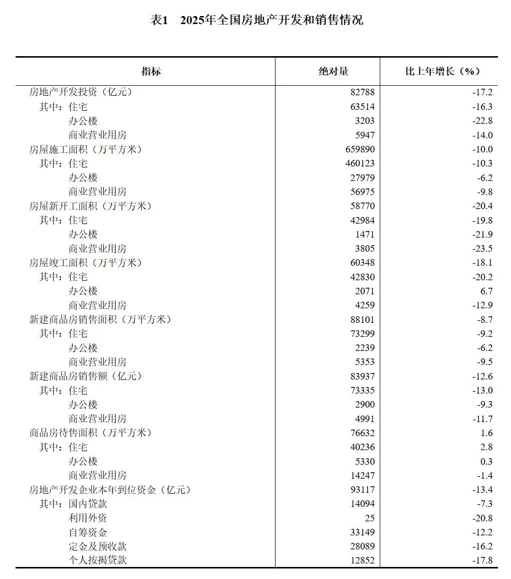 2025年,全国房地产开发投资82788亿元,比上年下降17.2%