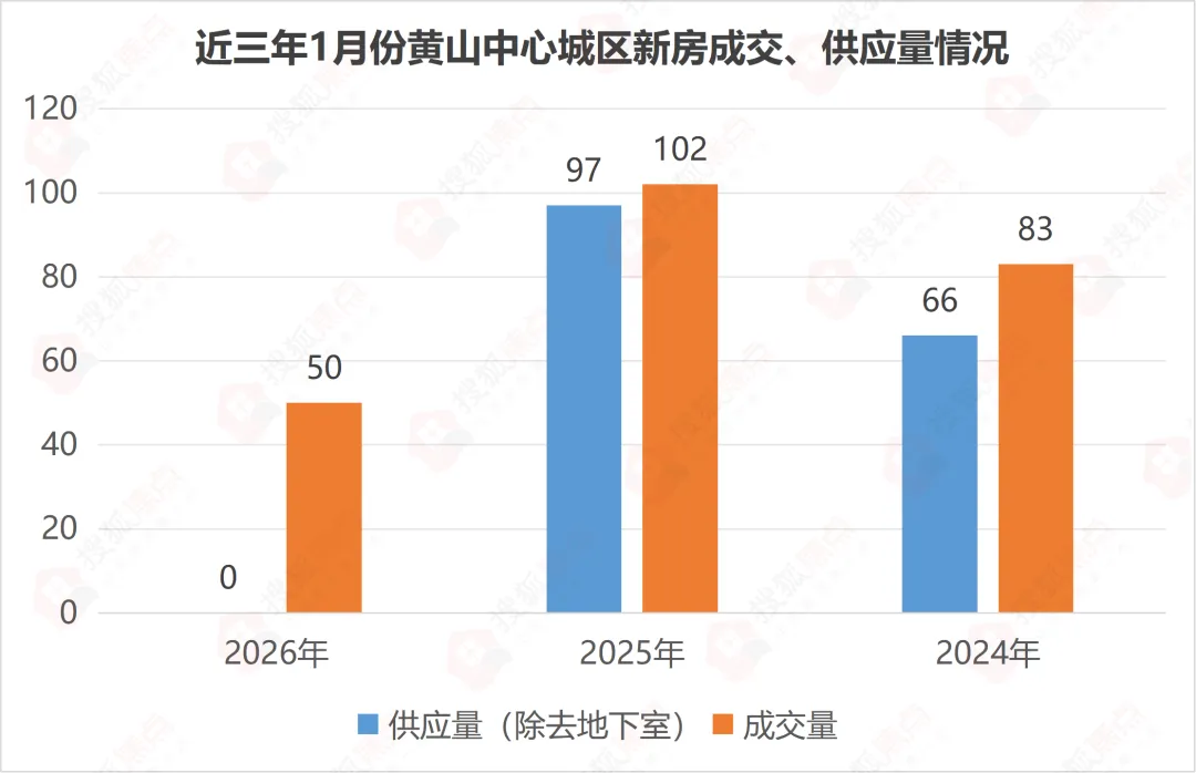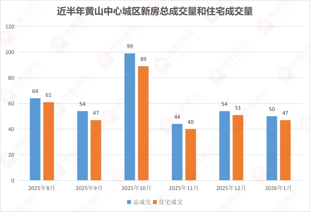 2026年1月黄山中心城区新房成交50套,环比2025年12月的54套下降7.4%,同比2025年1月的102套下降50.98%,其中普通住宅成交47套,为市场成交主体。
