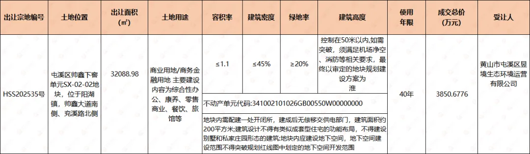 1月23日,屯溪区帅鑫下窖单元SX-02-02地块(宗地编号HSS202535号)成功出让。地块位于阳湖镇,帅鑫大道南侧、兖溪路北侧,出让面积32088.98㎡(48.13亩),成交总价3850.6776万元,成交单价80万元/亩(1200元/㎡),成交楼面地价1090.9元/㎡。