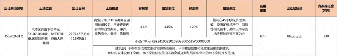 1月12日,屯溪区帅鑫下窖单元SX-02-06地块挂牌,地块位于阳湖镇,医院路南侧、帅鑫大道北侧,土地性质为商业用地/商务金融用地,出让面积12725.45平方米(19.09亩),起拍总价:1641.5831万元,起拍单价:86万元/亩(1290元/㎡),起拍楼面地价:678.9元/㎡。容积率R≤1.9。拍卖时间:2026年2月11日15时30分。