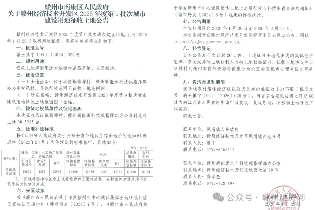 赣州经济技术开发区2025年度第9批次城市建设用地,已于2026年1月26日取得用地批复。规划用途为城镇村道路用地、公园绿地。位于凤岗镇路塘村、赣州新能源科技城指挥部办公室村尾村。土地30.5265亩。
