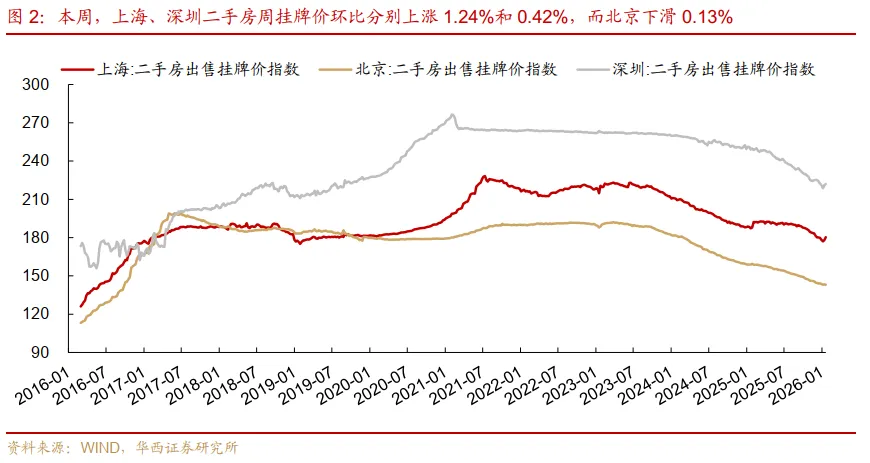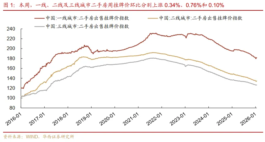 我们主要观察二手房价,因新房价格受推盘区域影响,波动往往较大。本周更新的是Wind披露的二手房出售挂牌价指数(周度)。
