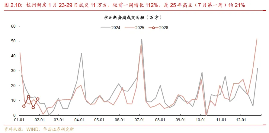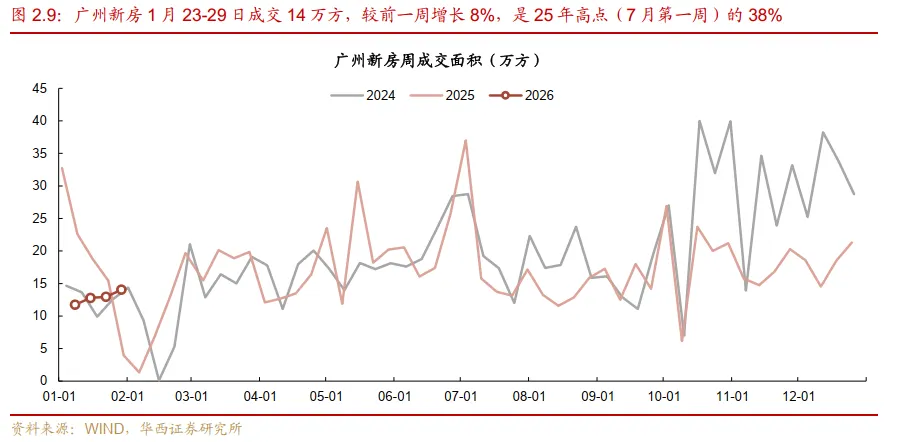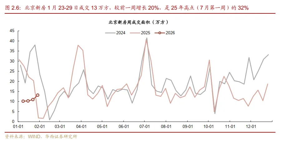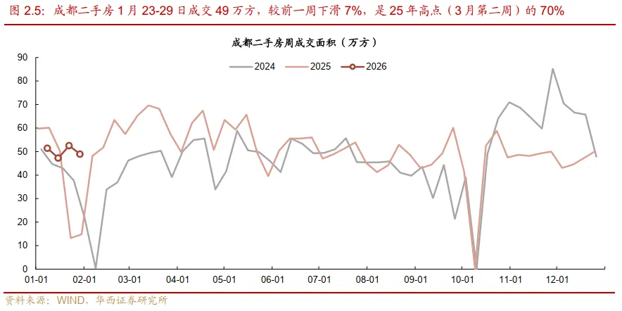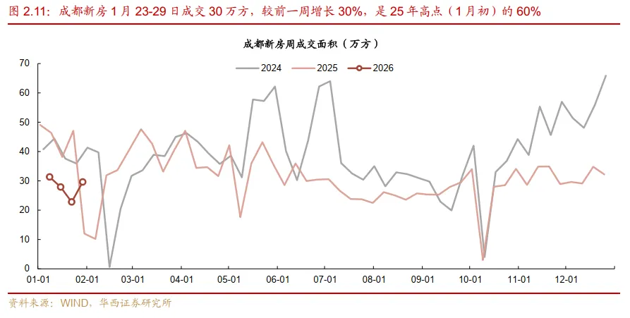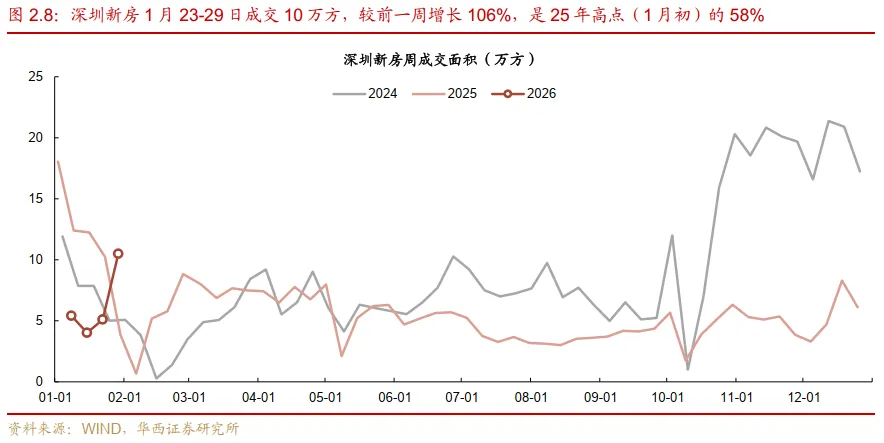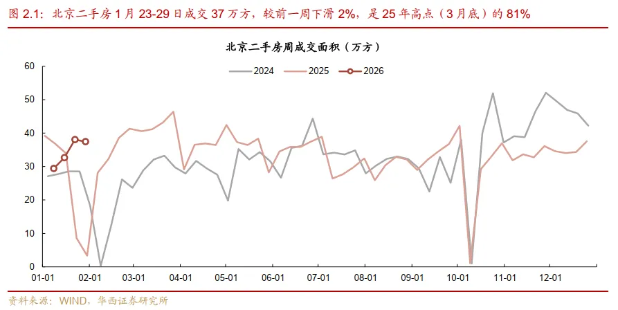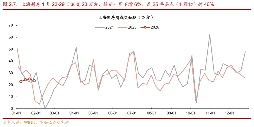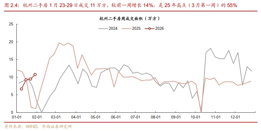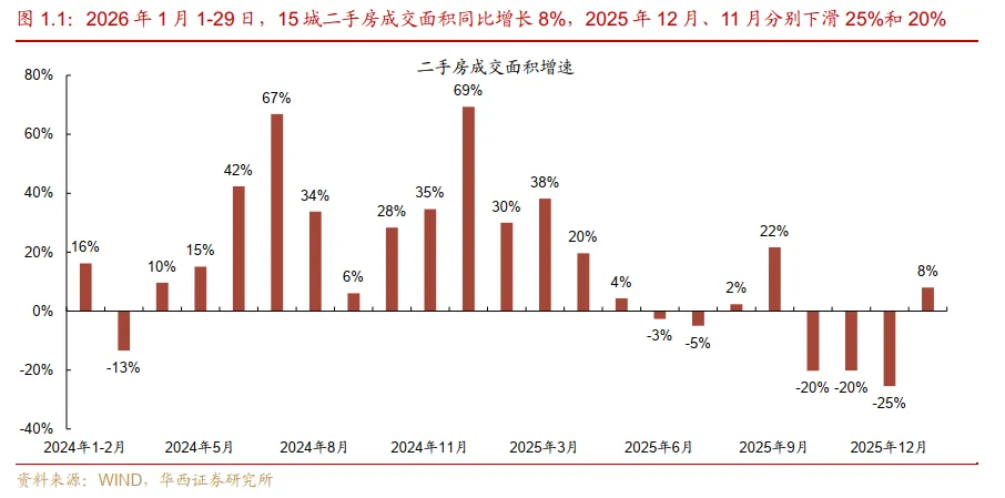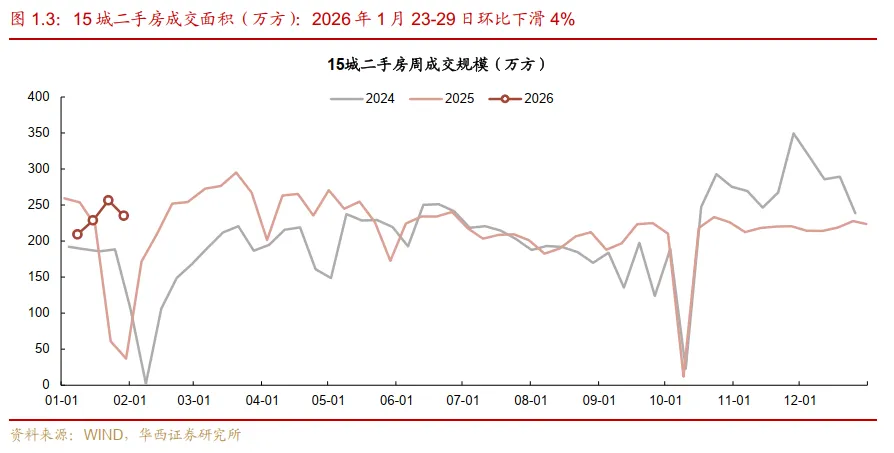 1月1-29日,高频数据显示二手房市场相对平稳。月初以来,15城二手房成交实现同比8%的增长(去年春节在1月);若剔除春节错位因素,较2024年同期(春节在2月)增长22%。这一表现显著好于2025年四季度的下滑20-25%,主要是2024年924之后,二手房销售放量导致基数偏高。从成交面积来看,1月周均成交234万平,相对去年12月的225万平,小幅增长4%,相对平稳。