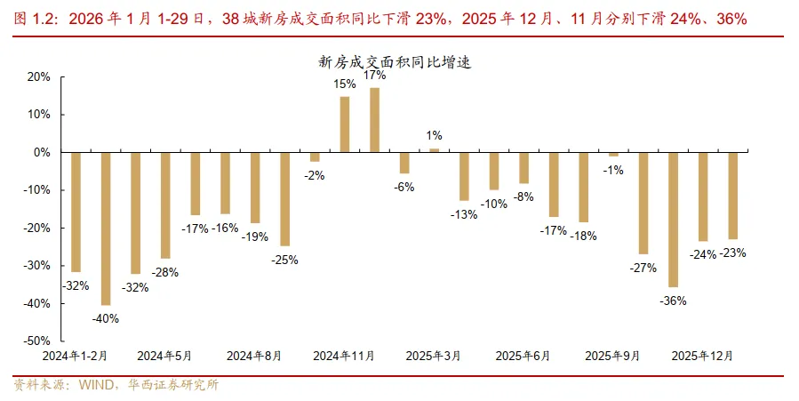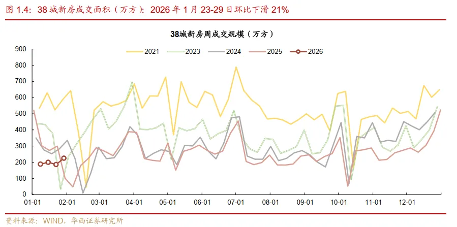 新房市场降幅依旧走扩,筑底过程尚未结束。新房市场表现依旧疲软,38城新房成交同比下滑23%,与2024年同期相比,降幅仍达29%。1月新房成交表现与2025年四季度24-36%的降幅水平相当,尚未出现反弹信号。