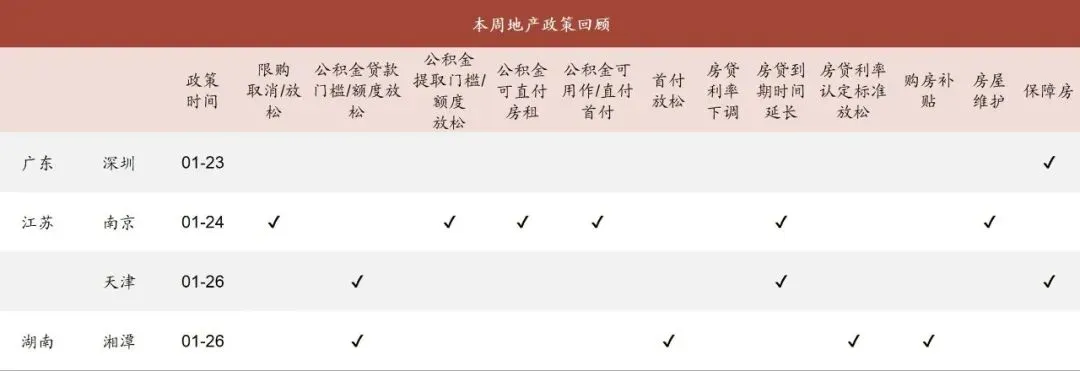 1月24日 南京市库存商品房全部纳入房票超市,提高公积金直付限额并延长贷款期限。推动既有库存商品房全部纳入房票超市;扩大提取住房公积金直付房租范围,无住房的多子女家庭公积金支付房租限额提高20%;购房人父母、子女符合提取条件的均可申请提取住房公积金用于支付购房款;延长存量房公积金最长贷款期限至30年。