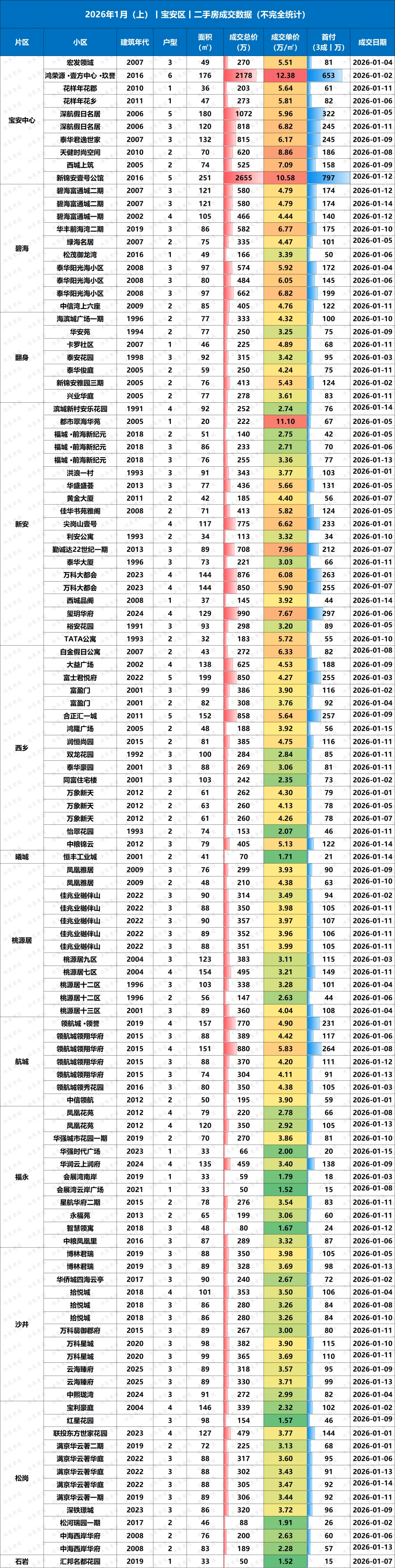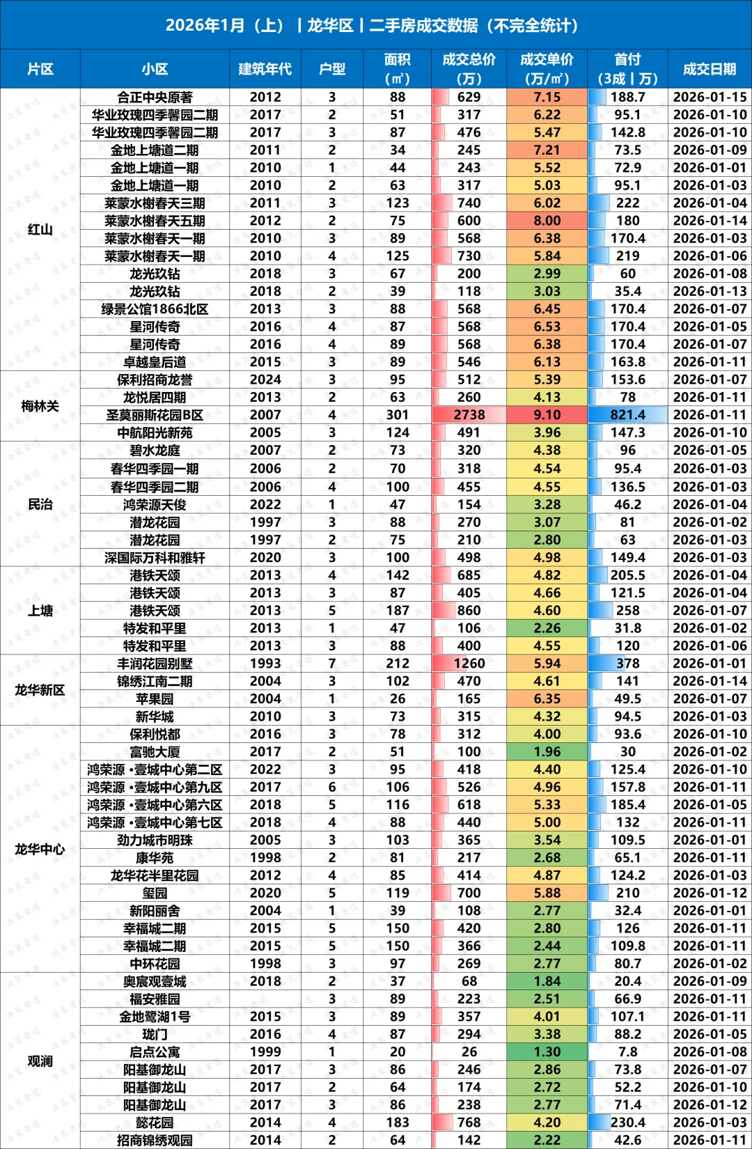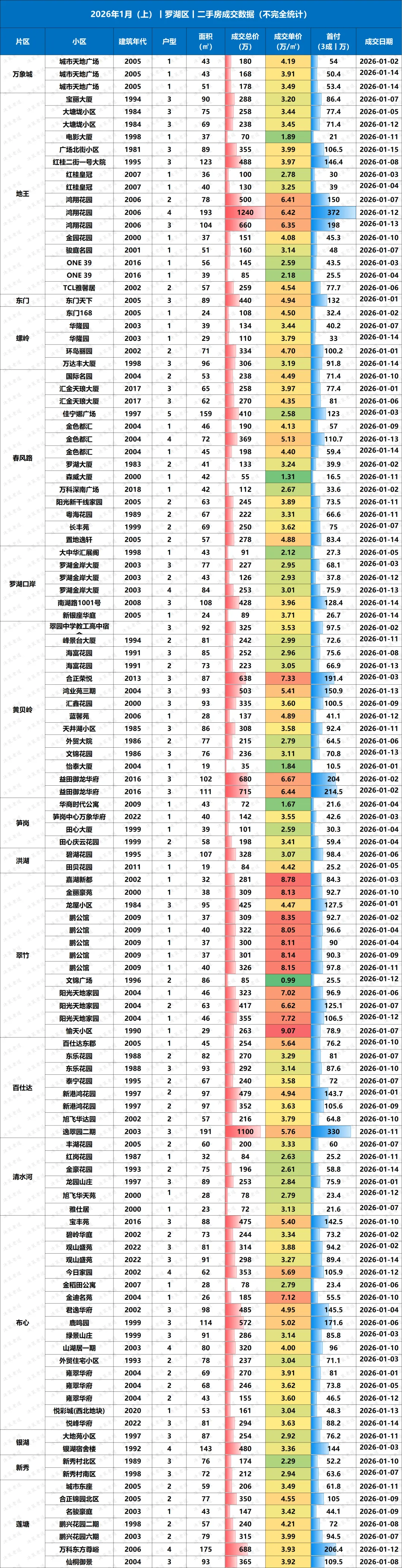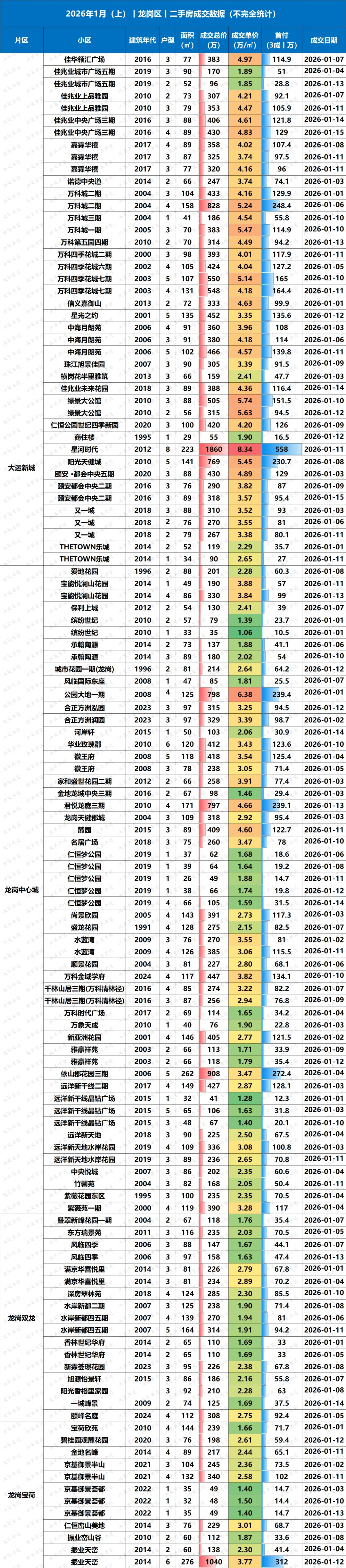 深圳楼市二手房2026.1月(上),真实成交数据