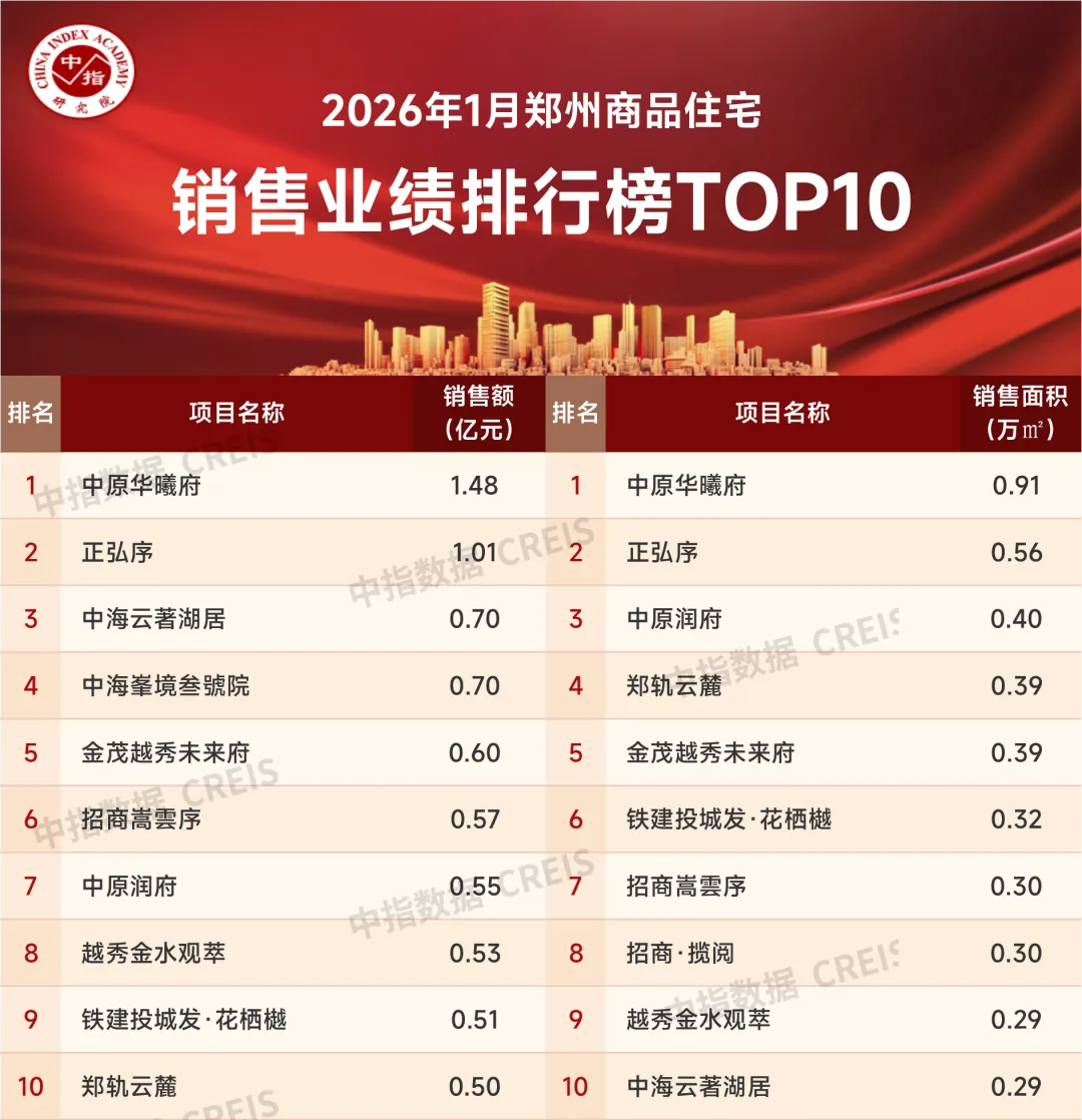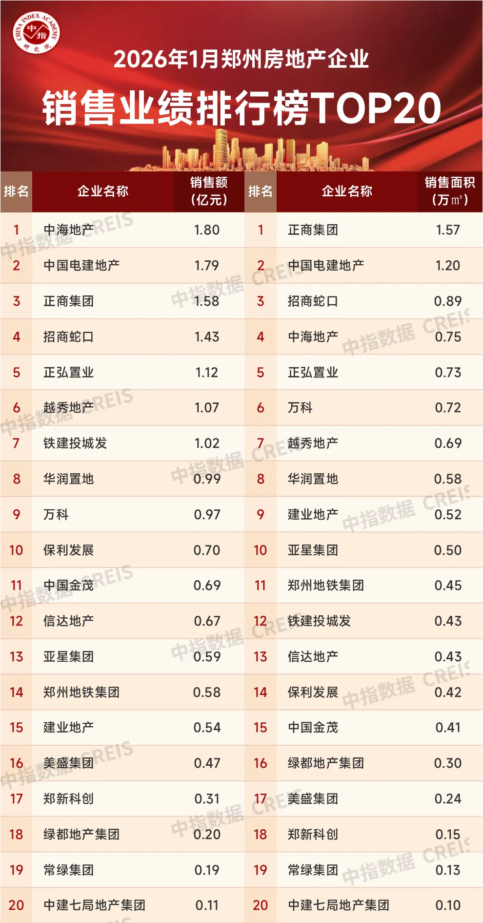 1月,郑州房地产市场进入传统淡季,商品住宅供应放缓,购房客户观望情绪有所加重,销售端整体呈走弱态势。二手房新增挂牌量持续多月下降,本月降至近年来低位水平,业主降价抛售心态逐步好转,二手房价格有望进入筑底企稳阶段,进一步对市场预期和信心提升起到支持作用。那么郑州的各个房企在2026年1月的销售业绩究竟如何?一起看一下数据表现:https://u.fang.com/ytcrnn/特别声明:房地产企业销售数据统计是以2026年1月1日-1月31日期间销售的商品房为统计口径,包括商品住宅、写字楼、公寓、商业全口径,主要依据中指数据CREIS(点击查看)在郑州市域范围的销售监测数据,并参考当期总体经营情况和推盘去化情况进行分析统计;对于少数没有在监测范围内的企业和项目,由企业提供相关文件,经审核,也纳入统计范围。本报告仅供参考,不对使用报告及其内容所引发的任何直接或间接损失承担责任。2026年1月,郑州房地产企业销售金额TOP20企业合计销售金额为16.82亿元,销售面积为11.22万平米。其中TOP10房企销售门槛值为0.70亿元/0.50万平米,TOP20上榜门槛值为0.11亿元/0.10万平米。销售金额方面,中海地产以1.80亿元成为销售金额榜冠军,中国电建地产以1.79亿元位列销售金额榜第二,正商集团以1.58亿元位列第三位;销售面积方面,正商集团、中国电建地产和招商蛇口分别以1.57万平米、1.20万平米和0.89万平米位列榜单前三位。特别声明:各房企项目销售数据统计是以2026年1月1日-1月31日期间销售的商品住宅为统计口径,主要依据中指数据CREIS(点击查看)在郑州市域范围的销售监测数据,并参考当期总体经营情况和推盘去化情况进行分析统计;对于少数没有在监测范围内的项目,由企业提供相关文件,经审核,也纳入统计范围。本报告仅供参考,不对使用报告及其内容所引发的任何直接或间接损失承担责任。