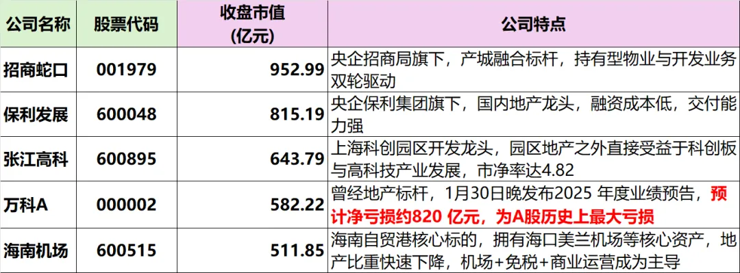 截至2026 年 1 月 30 日收盘(A 股 2026 年 1 月份最后一个交易日),全部A股TOP5的地产类上市公司市值如下: