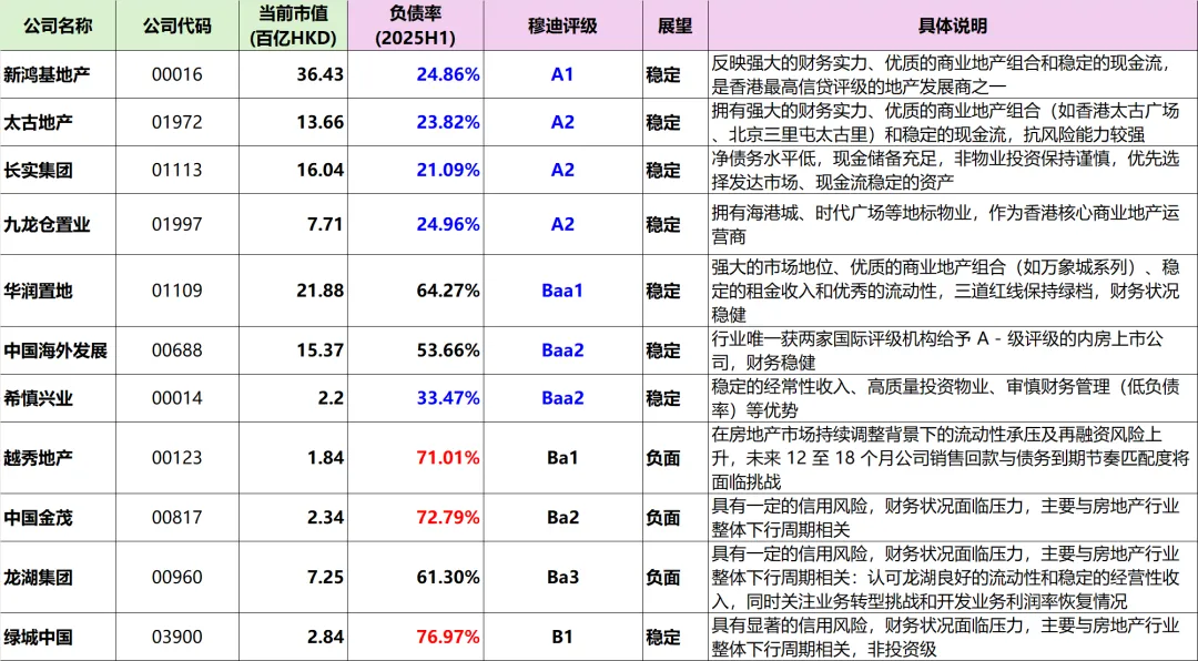 这里引入作为3大评级机构之首---穆迪的评估,以外部挑剔的财务角度来评估,作为某种压力测试。毕竟很多地产公司在港股上市,在不同阶段都安排了主体以美元计息的融资(在前几年美元升值再加美元利率加息周期中,进一步恶化了大部分地产公司的资产负债情况,所谓的“双杀”)。