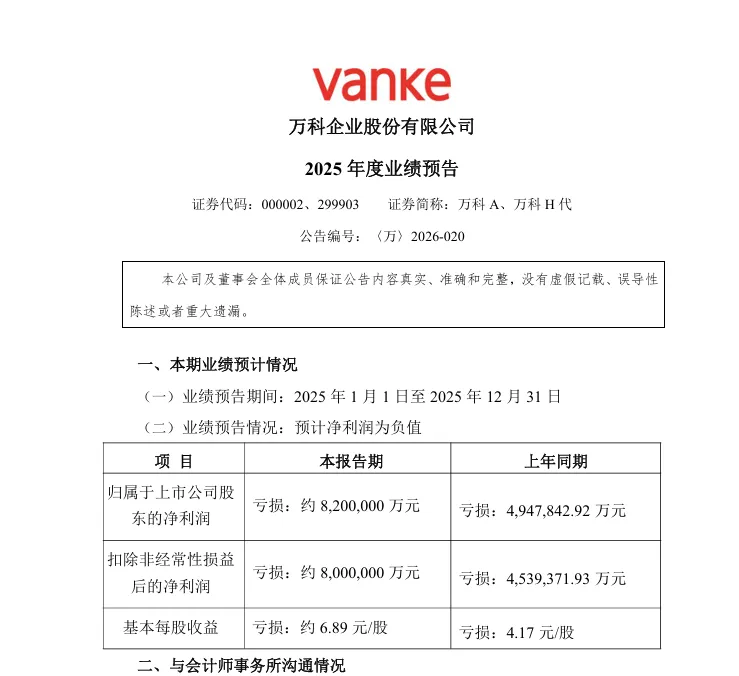 最新的消息,刚刚1月30日万科企业(万科A 000002.SZ)发布了业绩预告,2025年归母净利润预亏820亿元,扣非净利润预亏800亿,去年的亏损450亿看来就是小巫见大巫了。