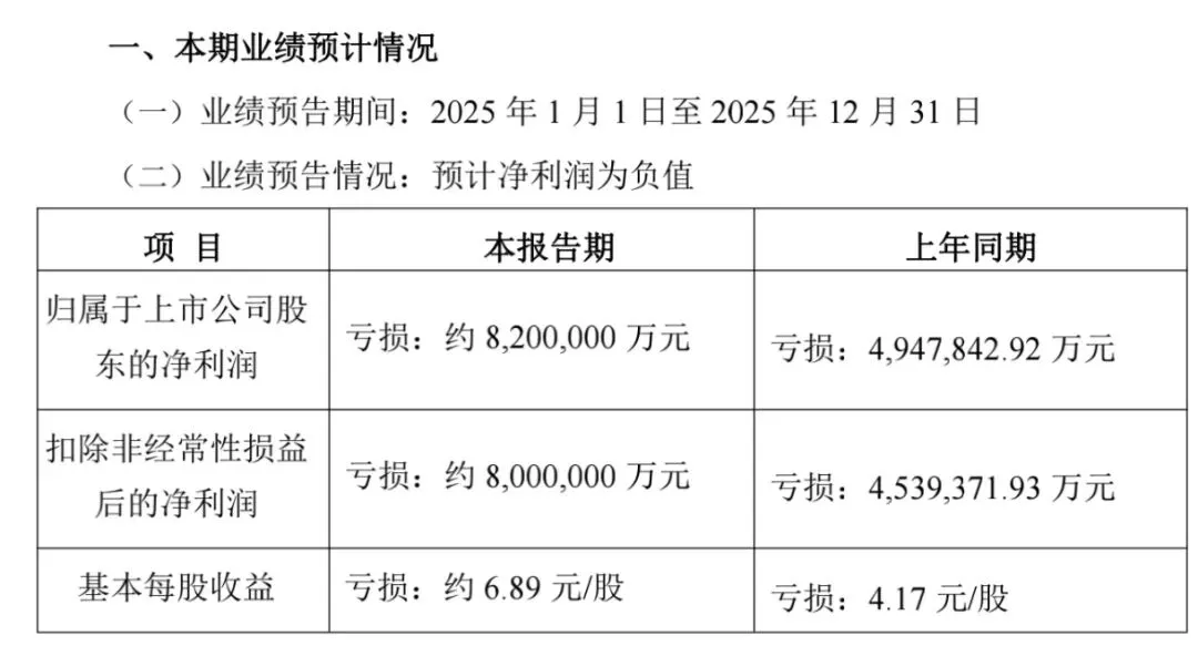 据万科2025年度业绩预告显示,预计2025年归母净利润亏损820亿元,上年同期亏损494.78亿元;扣非净利润亏损800亿元,上年同期亏损453.94亿元。