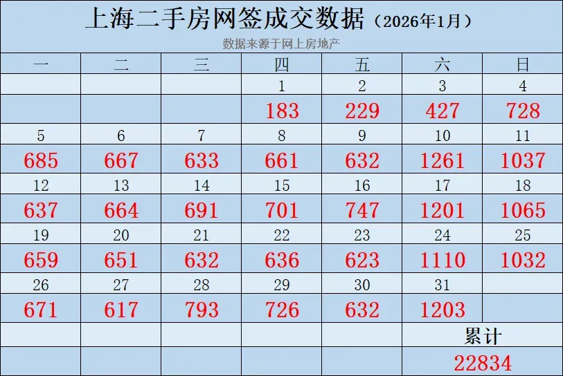 ▶ 上海1月二手房成交(统计截至1/31):1/31签约成交1203套,1月二手房累计签约成交22834套(数据源自网上房地产);