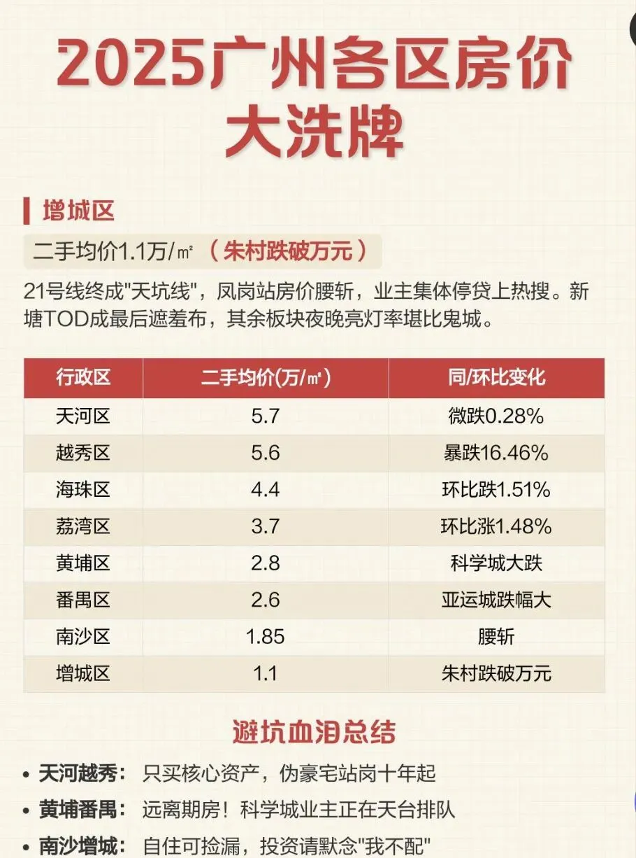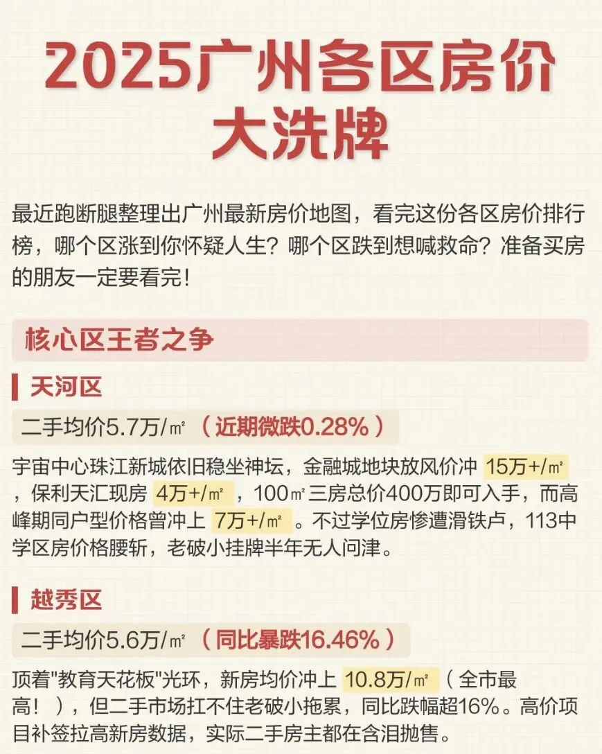 1⃣️天河区二手均价5.7万/㎡(微跌0.28%),珠江新城保持高位,金融城地块放风价15万+/㎡,保利天汇现房4万+/㎡。学位房遇冷,113中学区房价格腰斩,老破小滞销。2⃣️越秀区二手均价5.6万/㎡(同比暴跌16.46%),新房均价10.8万/㎡全市最高,但二手市场受老破小拖累严重,业主抛售现象普遍。