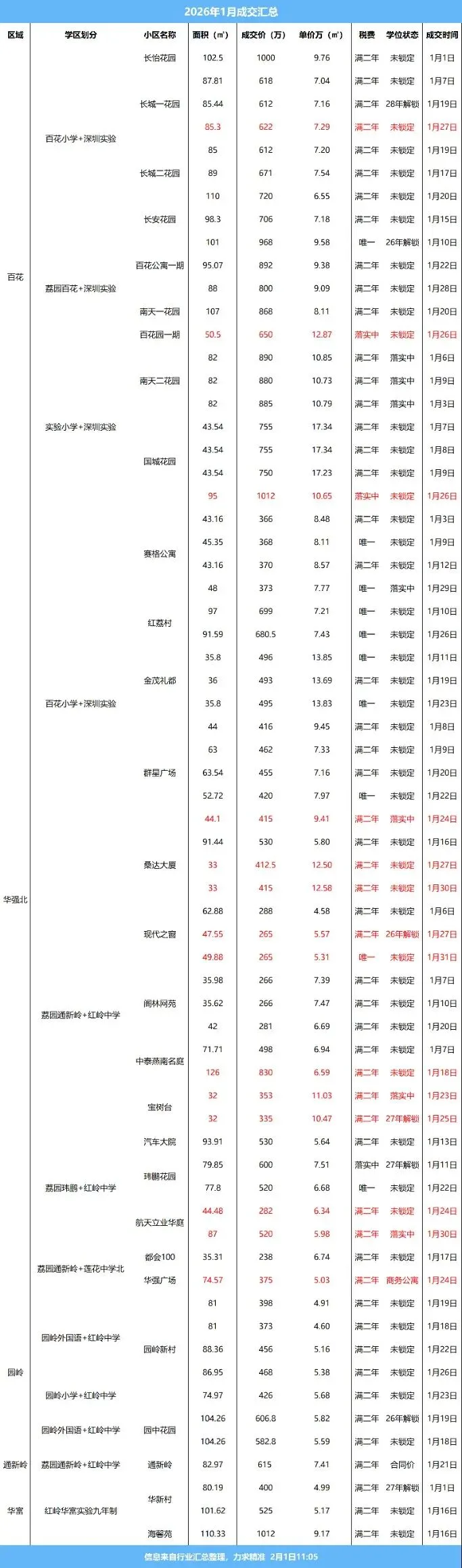 2026年1月31日,荔园/百花/实验小学/红岭中学/实验中学二手房学区房成交数据,仅供参考