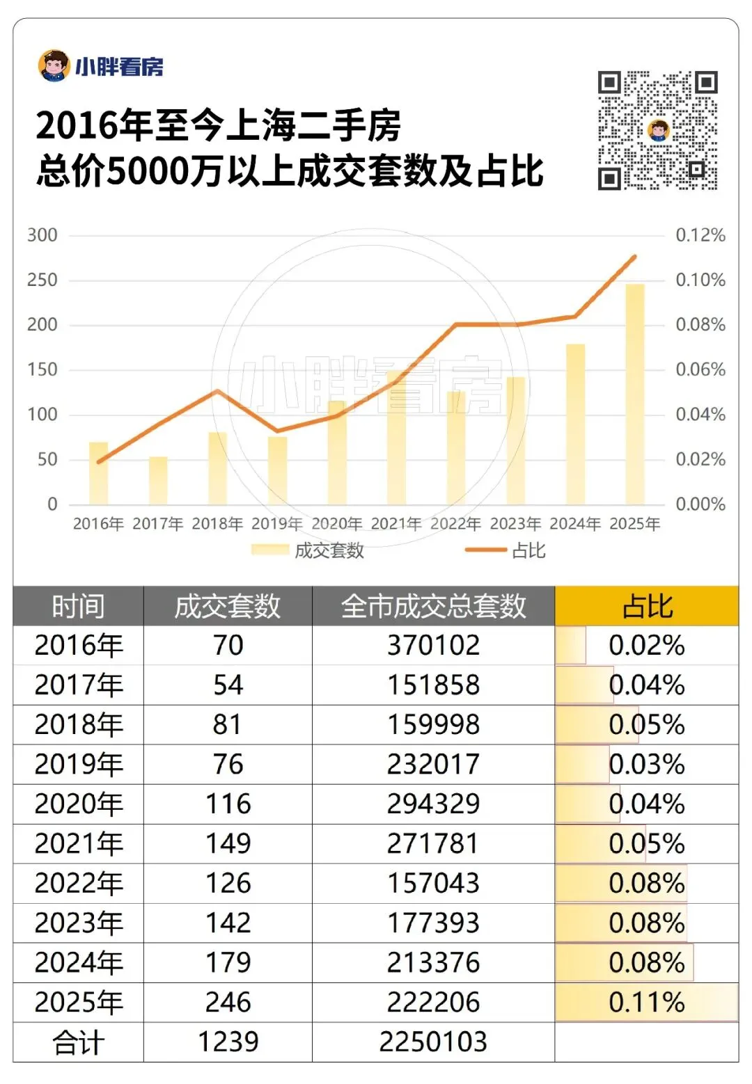 总价5000万以上的豪宅,是上海楼市毫无争议的金字塔尖!据数据统计,在过往的上海二手房市场里,每年成交的5000万以上豪宅屈指可数,常年占比总池子不到千分之一!而且,值得一提的是,顶豪和市场整体的成交量相关性非常弱,始终是走独立的行情· 在2016年,全市二手房合计成交超37万套,5000万以上豪宅却只成交了70套;· 在2020年,全市二手房合计成交超29万套,5000万以上豪宅却成交了116套;· 在2025年,全市二手房合计成交超22万套,5000万以上豪宅更是足足成交了246套!