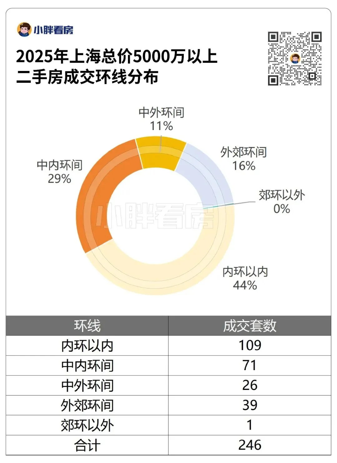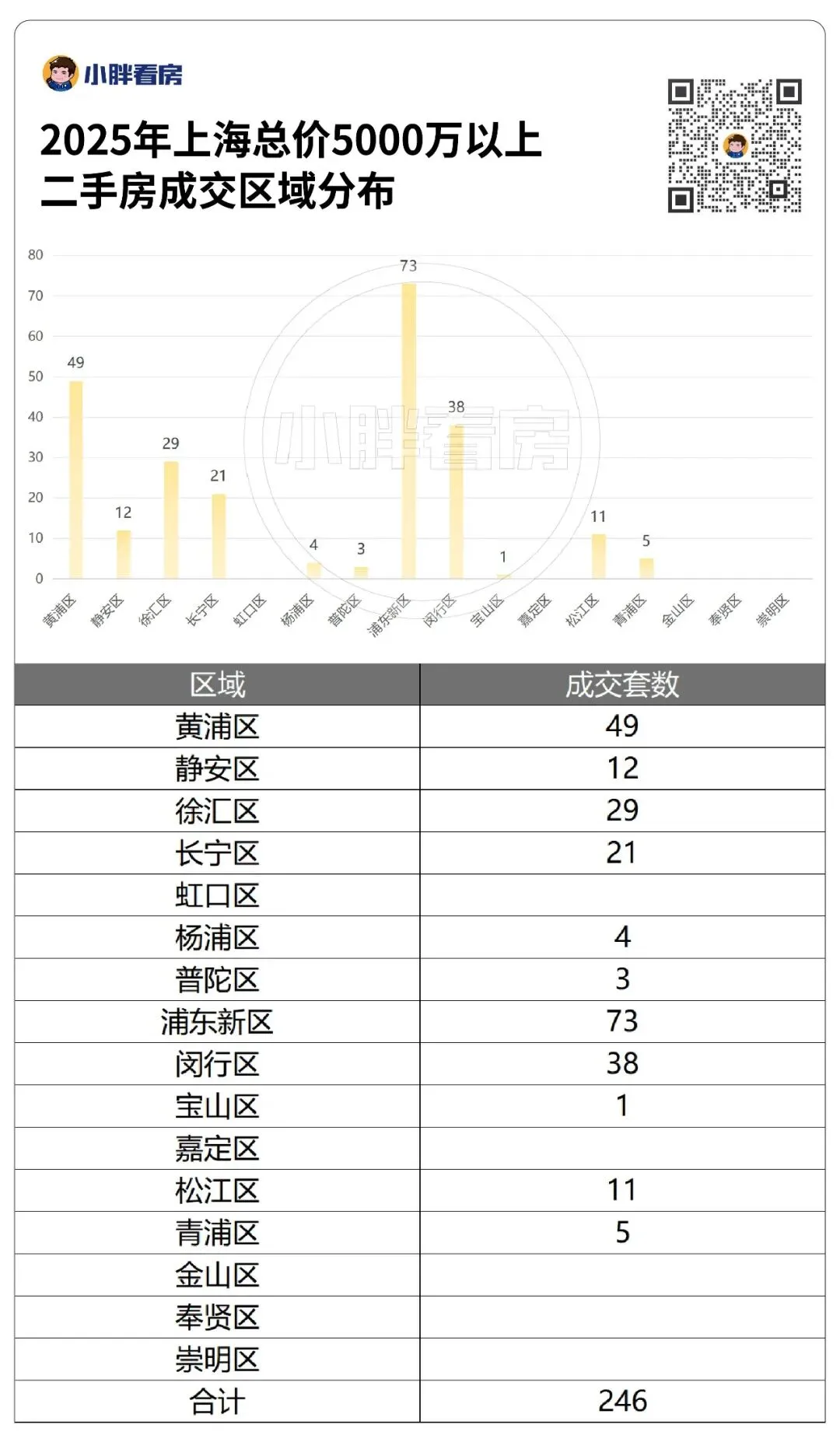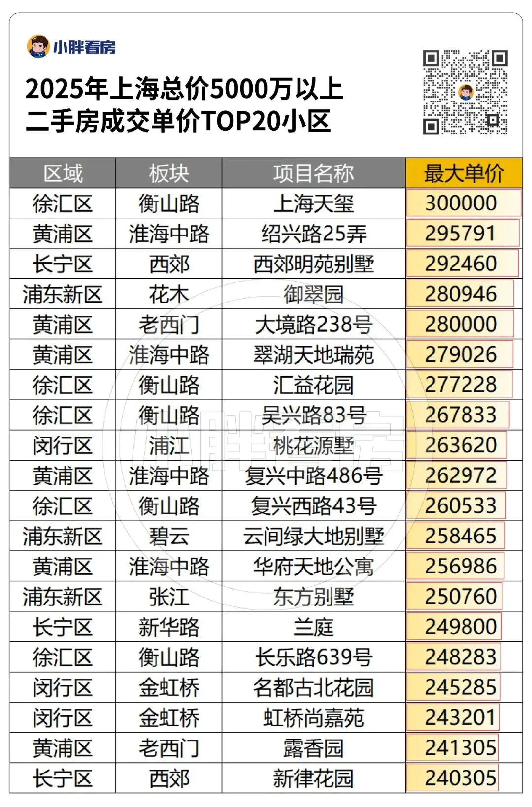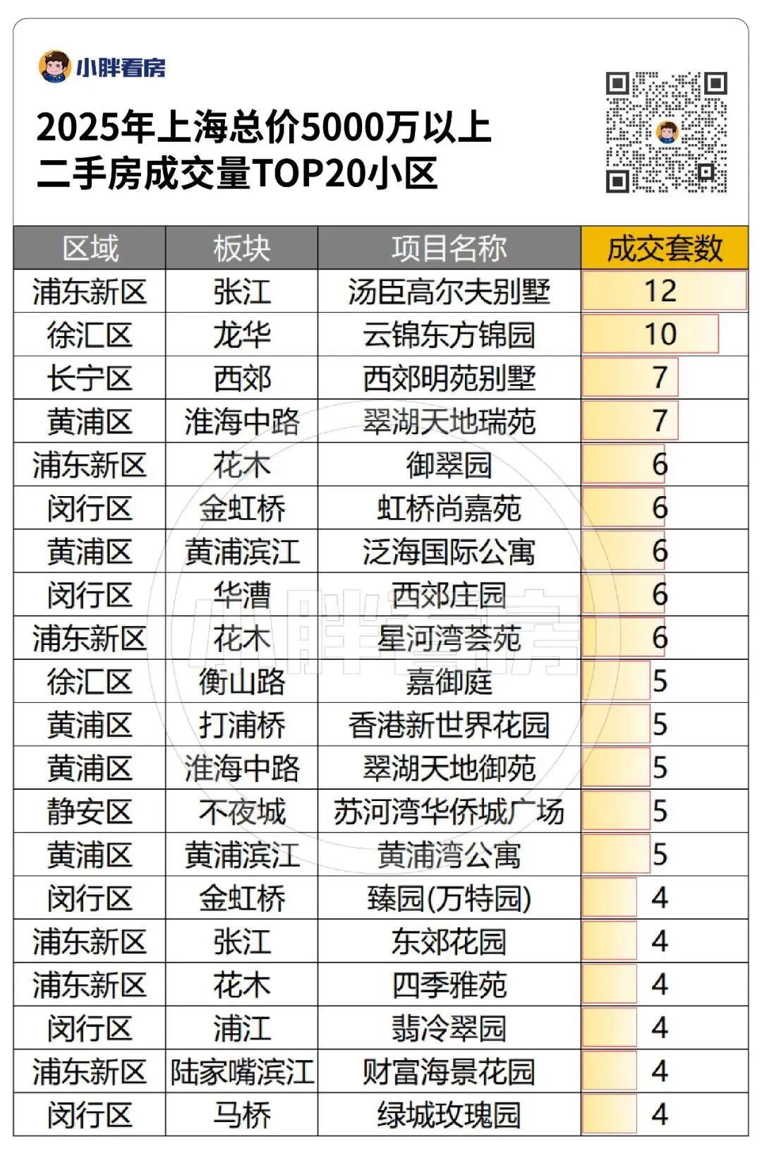 以上数据来自网上房地产二手网签数据,仅供参考作为这个城市最核心的资产之一,也是富豪们资产配置的工具箱,豪宅买家似乎有一套自己的逻辑今天小胖君就为大家带来总价5000万以上二手房豪宅的年度总结!以下是去年所有二手房的月度成交走势和总价5000万以上豪宅月度成交走势,大家可以对比下可以看到,金三银四的整体市场高潮,对于5000万以上豪宅的成交并没有协同性,单月成交量最高点出现在11月,整体成交量走势非常稳健我们把去年成交的246套豪宅房源按环线细分,不难发现:· 外郊环的豪宅以别墅为主,成交了39套,占比约16%,明显低于2000-5000万总价段占比;对于豪宅买家来说,地段无疑是第一购买因素,内环内的大尺度豪宅比郊区的别墅更有吸引力我们再对这246套房源按区域细分,地段来源会更清晰:· 张江、花木、陆家嘴滨江都是豪宅圈层认可的地段,购买力相当旺盛,整个区域成交73套,占比约29.67%;· 黄浦虽然范围小,但寸土寸金,有49套成交,占比约20%;· 紧随其后的是闵行,成交了38套,徐汇成交了29、长宁也有21套成交;· 松江力压青浦,成为郊区中成交最多的,整个区域成交了11套;最后聚焦到小区,来看去年总价5000万以上豪宅成交最多的小区都是谁?前20名浦东、闵行和黄浦占比8成,是绝对的成交主力!其中排名第一的是来自张江的汤臣高尔夫别墅,地段、产品受到豪宅买家认可,成交12套!排名第二的是来自龙华板块的云锦东方锦园,成交约10套;特别提示:以下对于豪宅价格的分析,我们采用网签成交价数据先看整体走势,在2020年总价5000万以上豪宅的成交均价约13.8万/㎡左右2023年均价飙升至16.8万/m²,2025年下降到15.9万/㎡左右!我们把去年网签总价5000万以上豪宅的成交按环线划分:· 而到了外郊环,成交均价只有约12万/㎡,郊环外成交均价更是只有5.65万/m²· 买在长宁、徐汇,成交均价也要18.1万/㎡左右;· 买在闵行,成交均价要低一些,约13.4万/m²;· 买在郊区,别墅均价同样不低,在11.2-12万/㎡左右;最后我们来看,去年总价5000万以上的豪宅单价最贵的都来自哪些小区?排名第一是徐汇衡山路的上海天玺,成交单价30万/㎡;排名第二是黄浦淮海中路的绍兴路25弄,成交单价超29.5万/㎡;排名第三是长宁西郊的西郊明苑别墅,成交单价约29.2万/㎡;排名第四的是浦东花木御翠园,成交单价约28.1万/㎡紧随其后的还有翠湖天地瑞苑、桃花源别墅、云间绿大地别墅、东方别墅、露香园等知名豪宅,成交单价全部在24万/m²以上!据链家网2026年1月11日数据,总挂牌房源为85962套,其中挂牌总价5000万以上的房源有302套,占比总池子约0.35%!· 内环内挂牌占比约50.66%,比例高于前文提到的成交占比,竞争环境相对紧张;· 内外环间挂牌占比约27.5%,比例低于前文提到的成交占比,竞争环境相对宽松;仅从环线细分可以判断,内环大平层想要快速卖出,可能需要一定程度的让利幅度!如果把这302套挂牌总价5000万以上的房源按区域细分虽然浦东和黄浦仍然稳居第一第二,不过闵行排名第三可能是比较超出很多人预料的,高端市场活力十足目前链家网挂牌的总价5000万以上房源房龄集中在10-20年,也就是零几年为主!10年内的次新房占比约30%,30年以上的老小区只有3%小胖君用最新的挂牌数据与2025年1月1日进行匹配,其中有101套挂牌总价5000万以上的房源匹配成功,其中豪宅虽然有自己独立的行情,但在挂牌量激增的背景下,豪宅房东想要顺利快速卖出,让利几乎成为常态!最后来看,近1年挂牌价5000万以上的豪宅降幅最大的都是谁?关于更多上海楼市的信息,或者您想和其他购房小伙伴一起咨询讨论,欢迎扫描下方二维码,添加小胖君,加入小胖看房@专属微信群~(备注:150000名小胖看房团群友数量来自2026年1月各微信群人数总和)