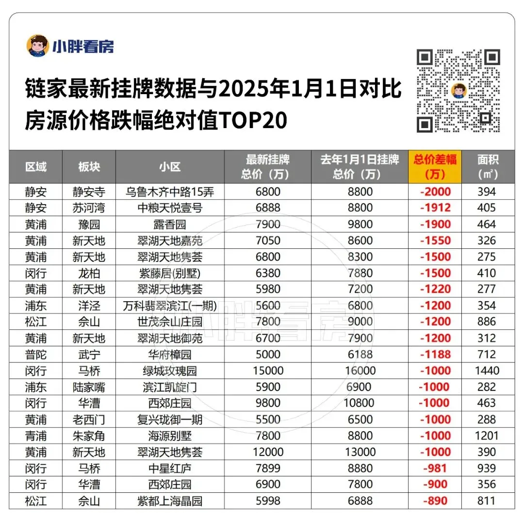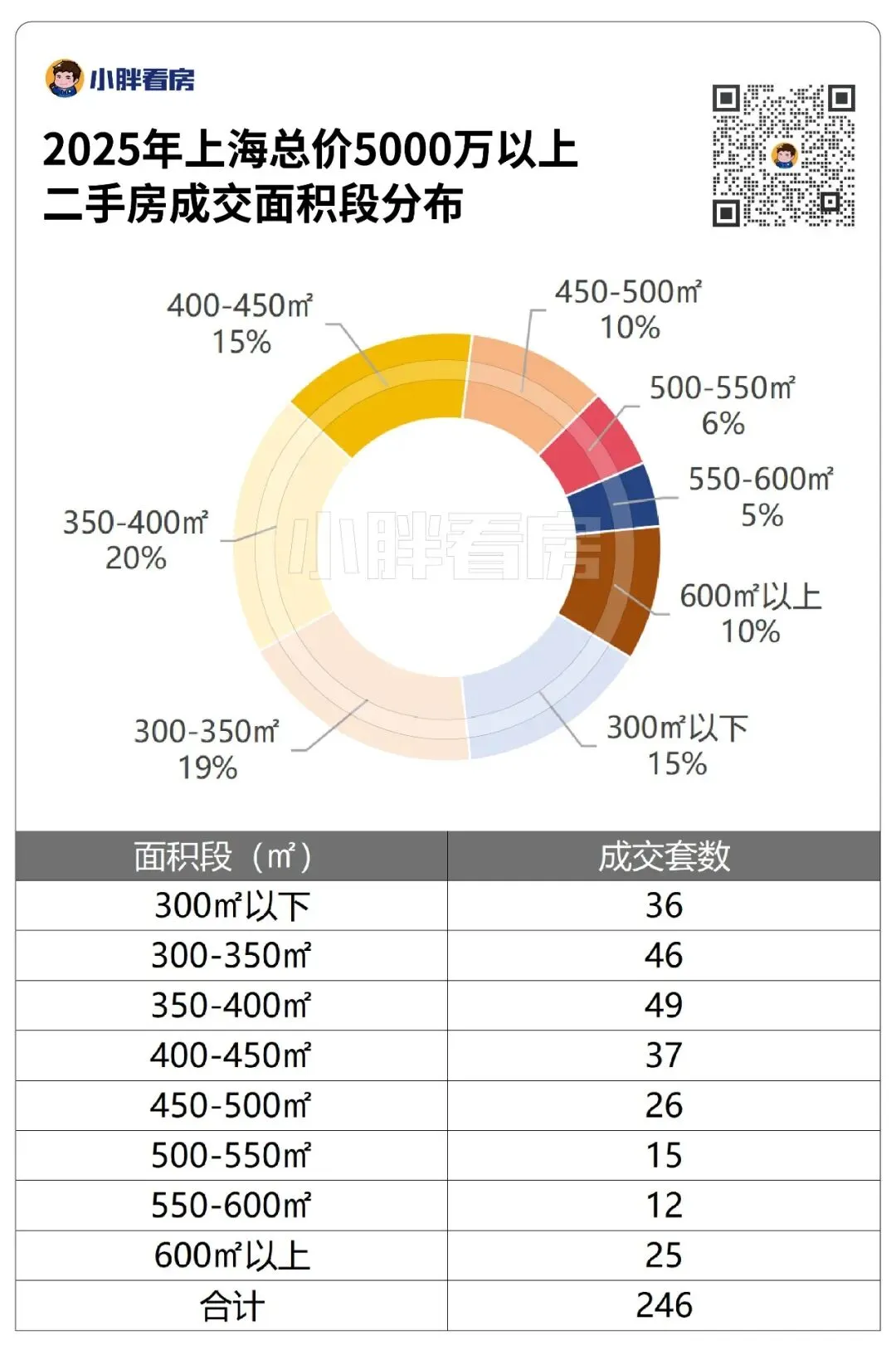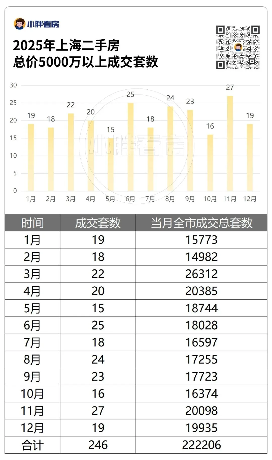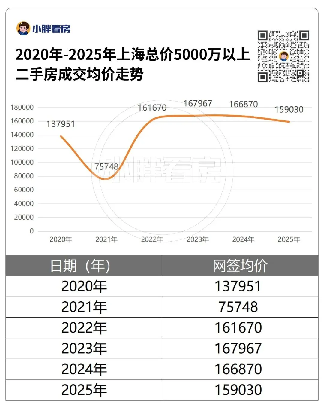 以上数据来自网上房地产二手网签数据,仅供参考作为这个城市最核心的资产之一,也是富豪们资产配置的工具箱,豪宅买家似乎有一套自己的逻辑今天小胖君就为大家带来总价5000万以上二手房豪宅的年度总结!以下是去年所有二手房的月度成交走势和总价5000万以上豪宅月度成交走势,大家可以对比下可以看到,金三银四的整体市场高潮,对于5000万以上豪宅的成交并没有协同性,单月成交量最高点出现在11月,整体成交量走势非常稳健我们把去年成交的246套豪宅房源按环线细分,不难发现:· 外郊环的豪宅以别墅为主,成交了39套,占比约16%,明显低于2000-5000万总价段占比;对于豪宅买家来说,地段无疑是第一购买因素,内环内的大尺度豪宅比郊区的别墅更有吸引力我们再对这246套房源按区域细分,地段来源会更清晰:· 张江、花木、陆家嘴滨江都是豪宅圈层认可的地段,购买力相当旺盛,整个区域成交73套,占比约29.67%;· 黄浦虽然范围小,但寸土寸金,有49套成交,占比约20%;· 紧随其后的是闵行,成交了38套,徐汇成交了29、长宁也有21套成交;· 松江力压青浦,成为郊区中成交最多的,整个区域成交了11套;最后聚焦到小区,来看去年总价5000万以上豪宅成交最多的小区都是谁?前20名浦东、闵行和黄浦占比8成,是绝对的成交主力!其中排名第一的是来自张江的汤臣高尔夫别墅,地段、产品受到豪宅买家认可,成交12套!排名第二的是来自龙华板块的云锦东方锦园,成交约10套;特别提示:以下对于豪宅价格的分析,我们采用网签成交价数据先看整体走势,在2020年总价5000万以上豪宅的成交均价约13.8万/㎡左右2023年均价飙升至16.8万/m²,2025年下降到15.9万/㎡左右!我们把去年网签总价5000万以上豪宅的成交按环线划分:· 而到了外郊环,成交均价只有约12万/㎡,郊环外成交均价更是只有5.65万/m²· 买在长宁、徐汇,成交均价也要18.1万/㎡左右;· 买在闵行,成交均价要低一些,约13.4万/m²;· 买在郊区,别墅均价同样不低,在11.2-12万/㎡左右;最后我们来看,去年总价5000万以上的豪宅单价最贵的都来自哪些小区?排名第一是徐汇衡山路的上海天玺,成交单价30万/㎡;排名第二是黄浦淮海中路的绍兴路25弄,成交单价超29.5万/㎡;排名第三是长宁西郊的西郊明苑别墅,成交单价约29.2万/㎡;排名第四的是浦东花木御翠园,成交单价约28.1万/㎡紧随其后的还有翠湖天地瑞苑、桃花源别墅、云间绿大地别墅、东方别墅、露香园等知名豪宅,成交单价全部在24万/m²以上!据链家网2026年1月11日数据,总挂牌房源为85962套,其中挂牌总价5000万以上的房源有302套,占比总池子约0.35%!· 内环内挂牌占比约50.66%,比例高于前文提到的成交占比,竞争环境相对紧张;· 内外环间挂牌占比约27.5%,比例低于前文提到的成交占比,竞争环境相对宽松;仅从环线细分可以判断,内环大平层想要快速卖出,可能需要一定程度的让利幅度!如果把这302套挂牌总价5000万以上的房源按区域细分虽然浦东和黄浦仍然稳居第一第二,不过闵行排名第三可能是比较超出很多人预料的,高端市场活力十足目前链家网挂牌的总价5000万以上房源房龄集中在10-20年,也就是零几年为主!10年内的次新房占比约30%,30年以上的老小区只有3%小胖君用最新的挂牌数据与2025年1月1日进行匹配,其中有101套挂牌总价5000万以上的房源匹配成功,其中豪宅虽然有自己独立的行情,但在挂牌量激增的背景下,豪宅房东想要顺利快速卖出,让利几乎成为常态!最后来看,近1年挂牌价5000万以上的豪宅降幅最大的都是谁?关于更多上海楼市的信息,或者您想和其他购房小伙伴一起咨询讨论,欢迎扫描下方二维码,添加小胖君,加入小胖看房@专属微信群~(备注:150000名小胖看房团群友数量来自2026年1月各微信群人数总和)