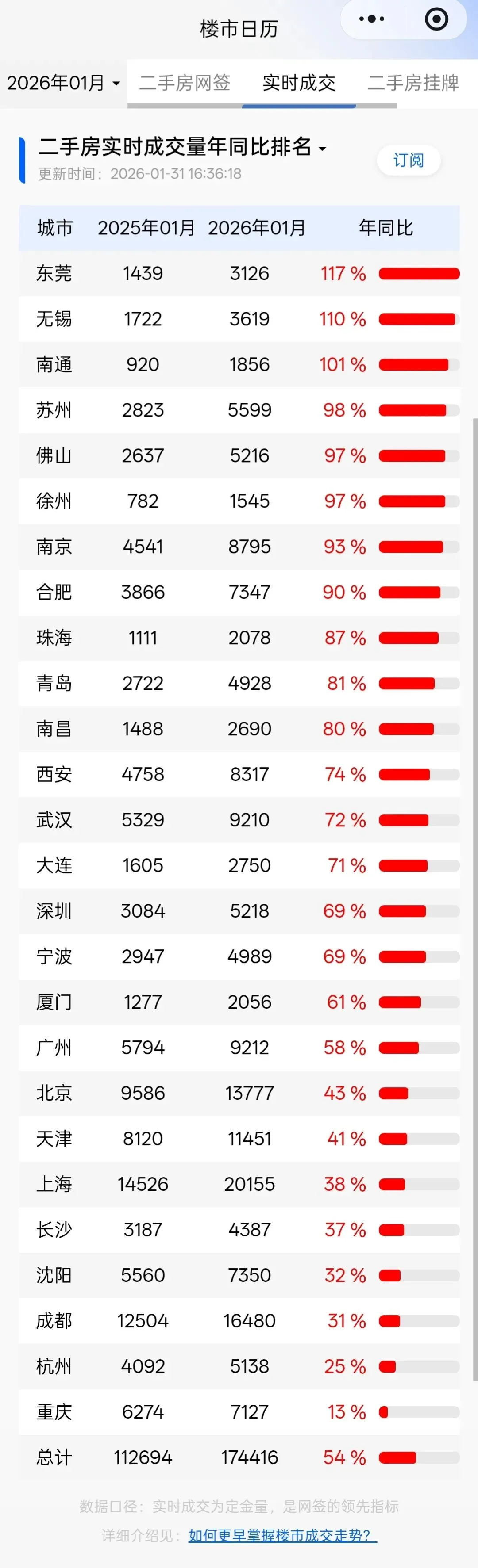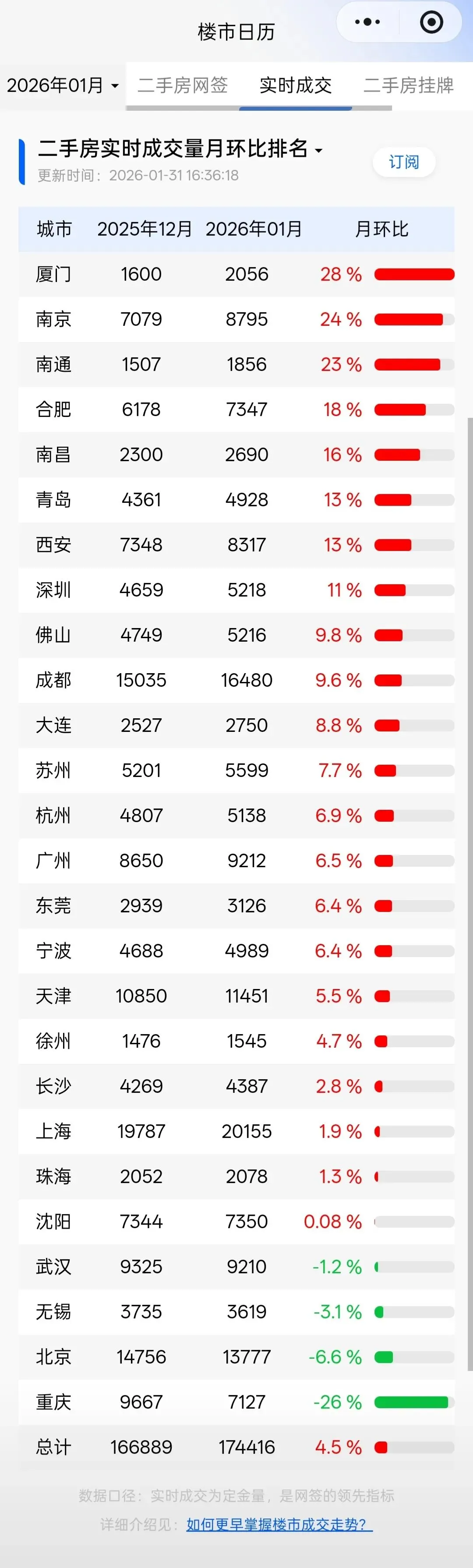 2026年1月份刚过去,全国二手房成交量无论是同比还是环比都出现了较大的放量上涨,也就是说这一轮行情并非厦门局部的小行情,而是一波全国性的普遍行情。接下来我们先看一下具体的数据(经过对比,不同平提供的台数据会有细微差距,具体以当地实际成交为准):同比2025年1月份,东莞上涨最多,达到117%,其次为无锡和南通、苏州,同比上涨都接近100%,厦门同二手房成交量上涨达到61%。环比2025年12月,全国增幅排名第一的城市为厦门,环比增幅达到28%(最新数据为35%),排名仅随其后的为南京、南通、合肥、南昌等城市。这一波成交量几乎与2024年的9月大救市之后的成交量相当,以厦门为例子,2026年1月的成交量为近三年1月的新高, 同比远超过2024、2025年,拉开近3年的数据,仅有2024年11月及12月的二手成交数据高过2026年1月成交数据约200套左右,剩下近3年所有月份二手房成交量均低于2026年1月的成交量。在没有如2024年9月那样的利好政策的情况下,为何成交量突然暴增?云哥认为这主要大家对于楼市的预期正在慢慢发生改变。从《求是》发文定调房地产到多个城市X壳隐藏客户端成交价以及各主要城市出台打击唱衰楼市自媒体,规范楼市舆论等动作。不少原处于观望边缘的人选择看房或者出手,同时一批处于观望状态的房东也开始陆续下架房源,在二手成交量持续攀升的情况下,挂牌量逐渐走低。即便市场在慢慢发生变化,但在看空楼市思维的惯性作用之下,目前看空楼市的人还比较多,就如同当年房价高点看多楼市的人一样,要打破这样的惯性思维需要成交量进一步提升并稳住。我们始终是政策市,无论是楼市还是股市以及其他和我们生活息息相关的的各个方面都是如此,因为我们几千年来就是大家长制,有形的手要比无形的手力量和影响力要大得多,如果不理解和接受这一大前提,很多的分析得出的结论都会南辕北辙。参考最近的股市就会更加理解大家长对于楼市,过热就降温,过冷就升温,只不过楼市没有股市那样操作简便,周期也不一样,过去也缺乏“国家队”的角色,如今在国、央企作为主流玩家的情况下,很多的预判不能再刻舟求剑。“国家队”什么时候进场,这是一个值得关注的信号,近期已有地方国资下场扫货法拍房从2024年起有地方收购商品房,不过跟进的城市不多,量也不大,对于市场的影响有限,这一局面在2026年肯定会迎来改变。