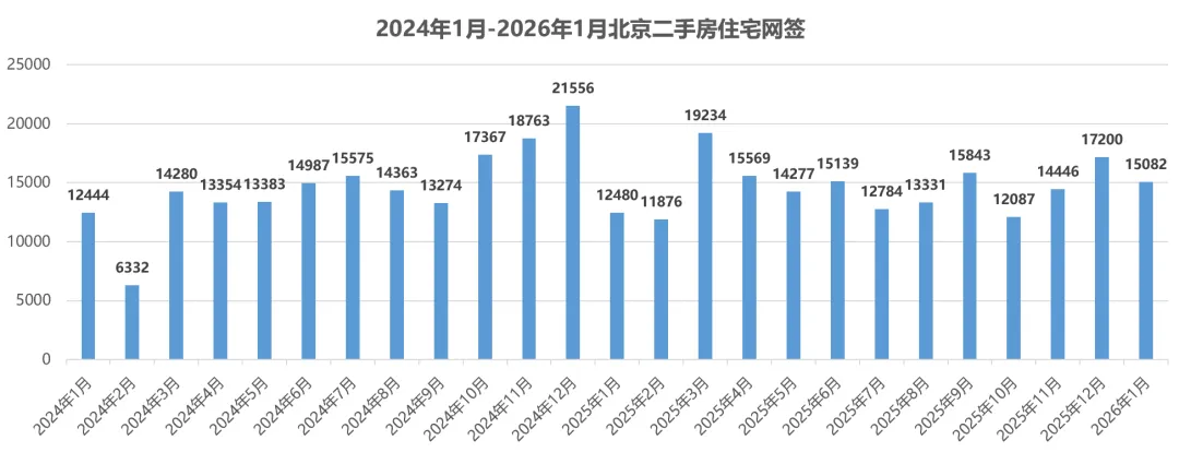 根据住建委的网签数据,1月北京二手房网签量为15082套。这个成交量是个什么水平?其实如果只是环比上月(也就是去年12月),1月的成交量并没有上涨,反而是下降了约12%。