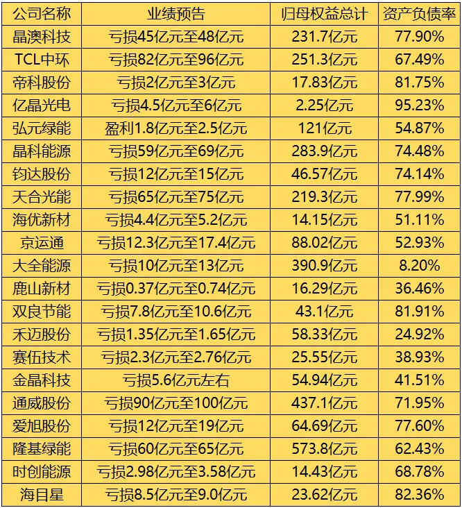 根据近期各家光伏企业发布的业绩预告显示,去年预计亏损额超40亿的企业有晶澳科技、TCL中环、晶科能源、天合光能、通威股份、隆基绿能,这几家合计最大亏损预计超450亿元。