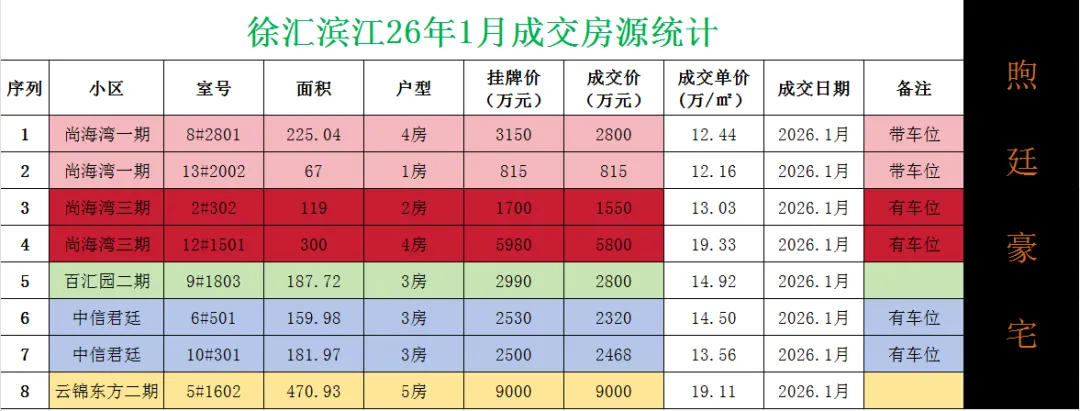 26年1月徐汇滨江二手房成交约8套房源,以下为统计表格。