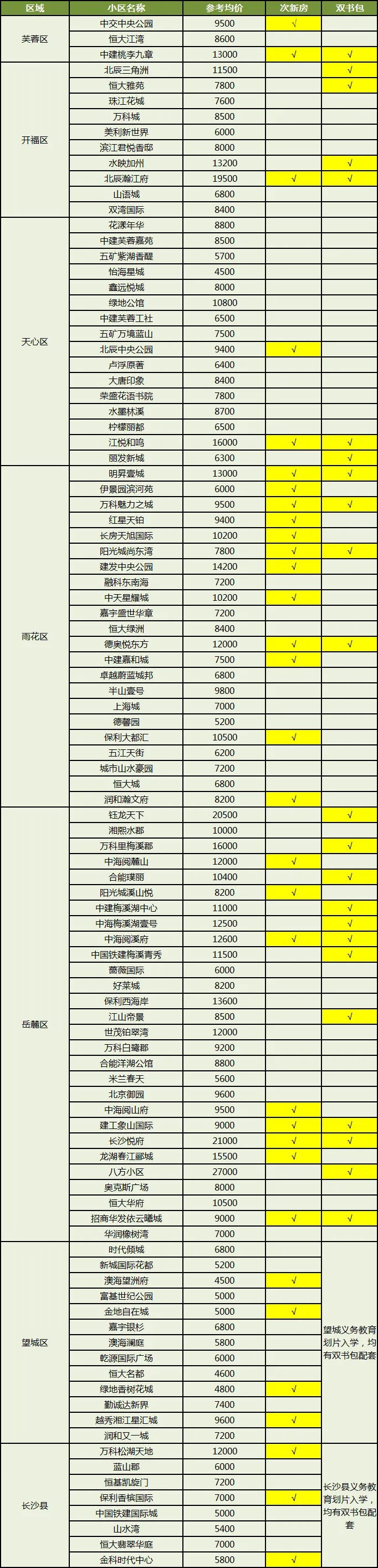 另外,除望城、长沙县外,有23个配套双书包的小区,这些小区不用参与微机派位,教育更方便,也是很多家长的选择。像中建桃李九章、德奥悦东方、江悦和鸣、中海阅溪府等更是兼顾“次新”和“双书包”两大特点。