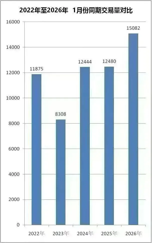 2026年一月份交易量对比过往近五年成交量大幅上涨📈,比2025年涨幅达到21%