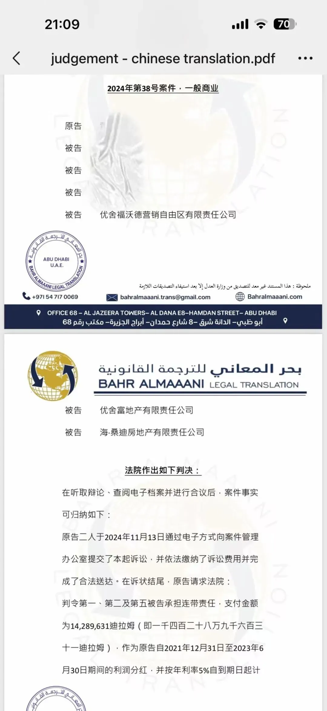 事隔两年整,黄某果向《陈勇评论》提供了一份迪拜法院的中阿双语判决书,称黄某和伏某两人作为原告,向法院起诉主张UCF Real Estate和Sun Rise Real Estate (Branch)两家公司的股份,黄某果和左女士都是被告。