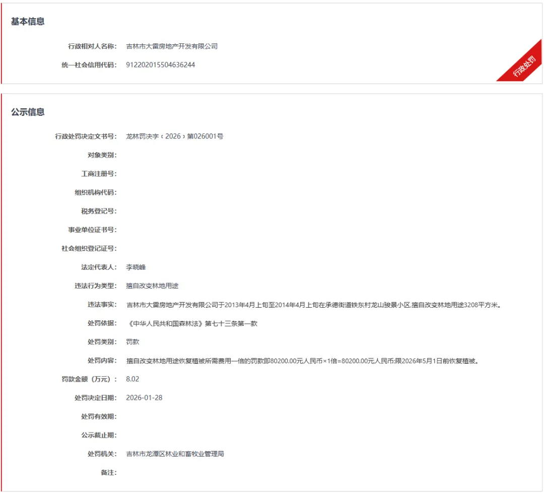 吉林市一小区地产被罚!限期恢复并罚款.....