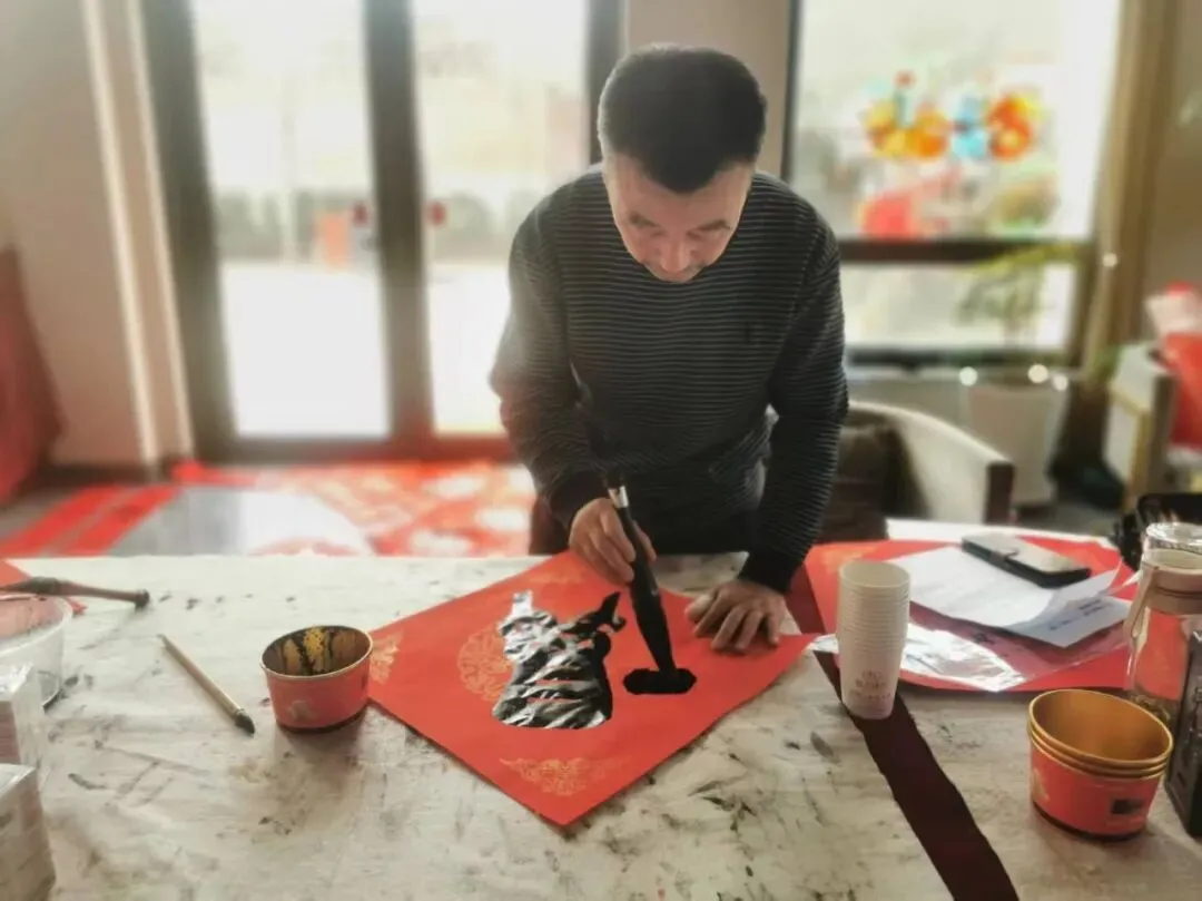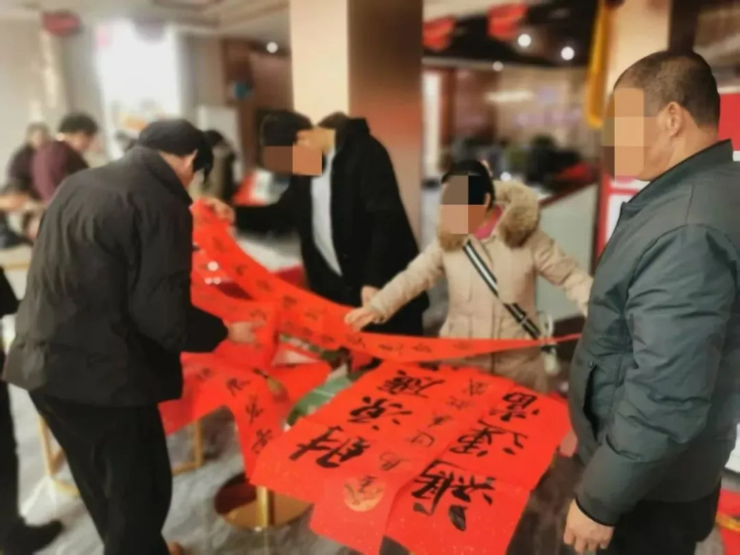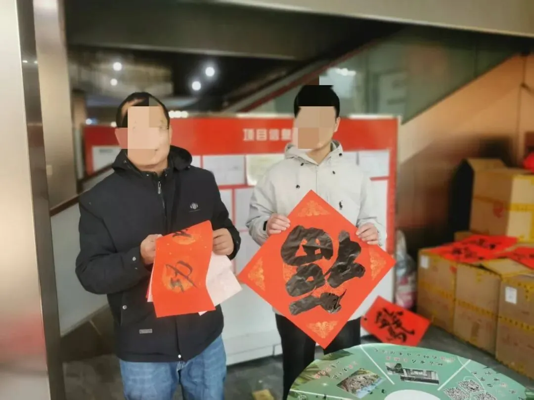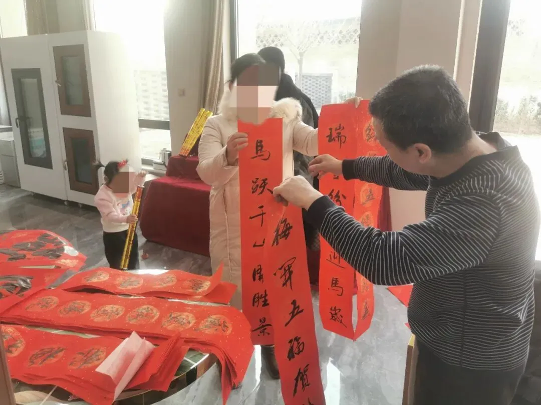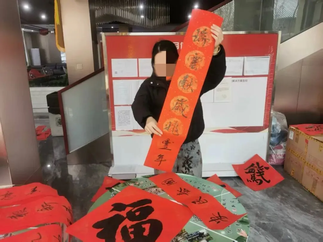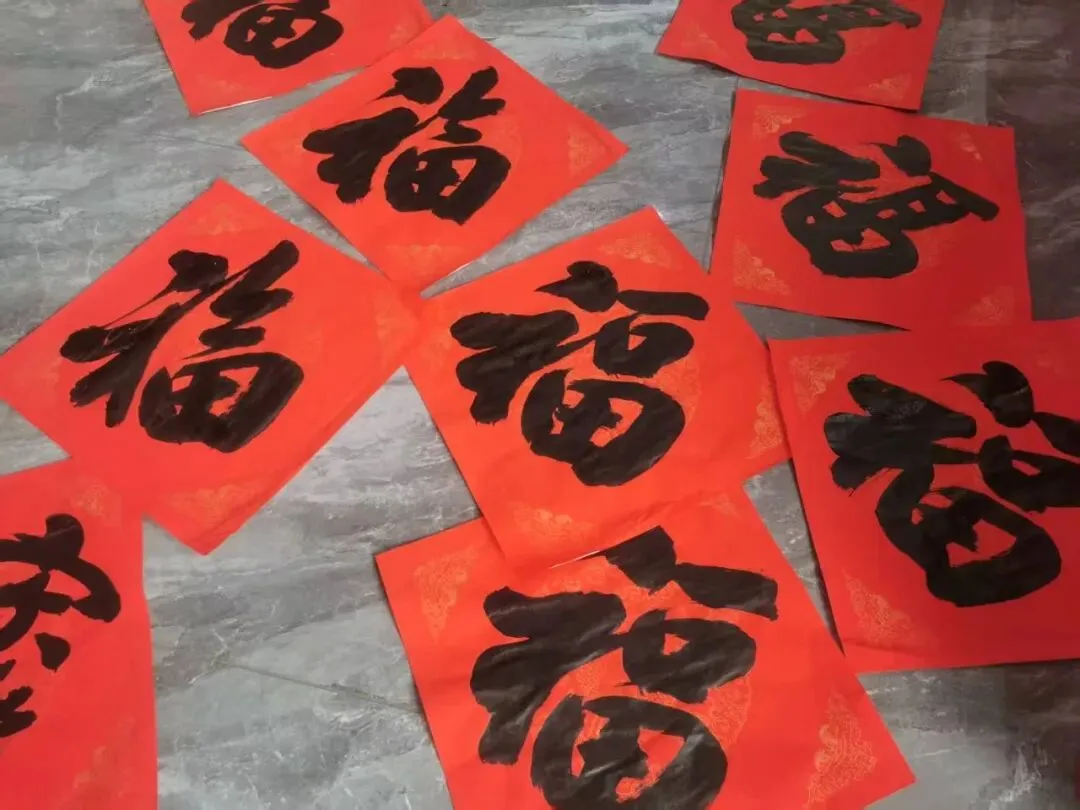 活动现场,翰墨飘香、文化流淌,书法老师挥毫泼墨,苍劲有力的字里写满了对新年的期待与愿景,一张张墨香浓郁,祝福满满的“福”字和春联,呈现眼前。
