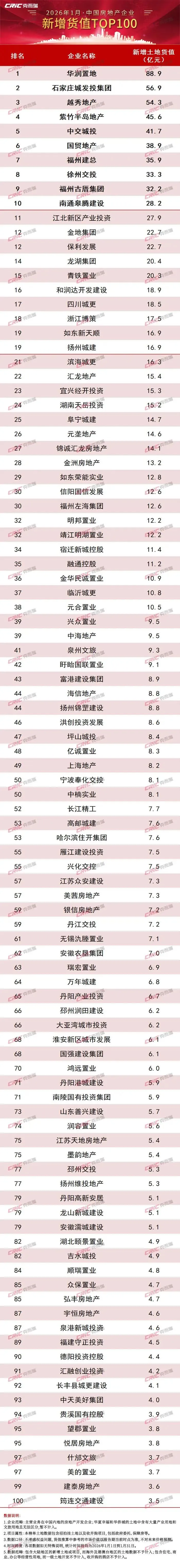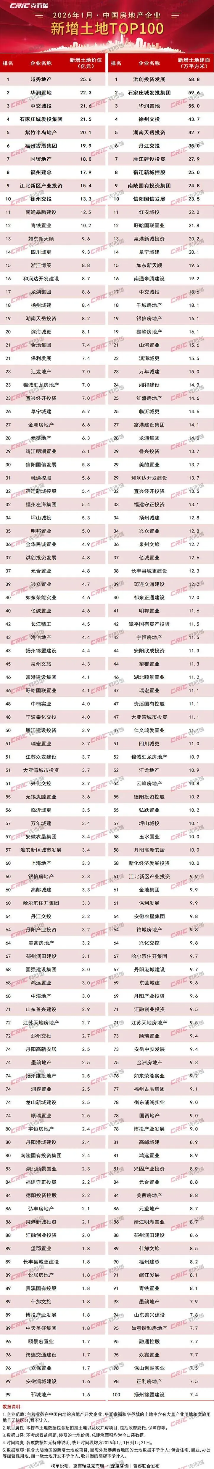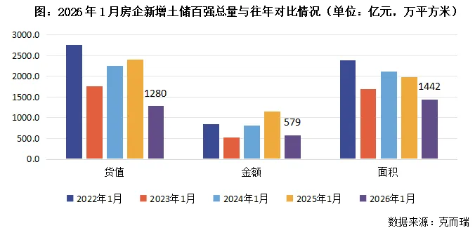 2026年1月份,新增土储百强房企的新增货值、总价和建面百强之和分别为1280亿元、579亿元和1422万平方米,货值、金额降幅近五成,面积较同期下降28%。主要是受到1月份多城尚未开启新一年供应的影响。