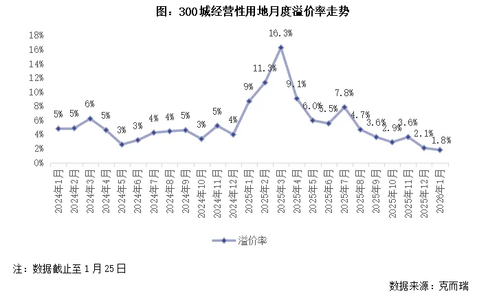 1月所有城市土地成交金额均不高于50亿元,交易规模进入季节性低位。平均溢价率为1.8%,如期低位回落。绝大多数10亿元以上的高总价地块均为底价成交。