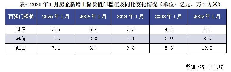 截止1月末,新增土储货值百强门槛值为3.5亿元,同比下降35%;新增总价百强门槛值为1.6亿元,同比下降20%,新增建面百强门槛值为7.4万平方米,同比降幅达到17%。