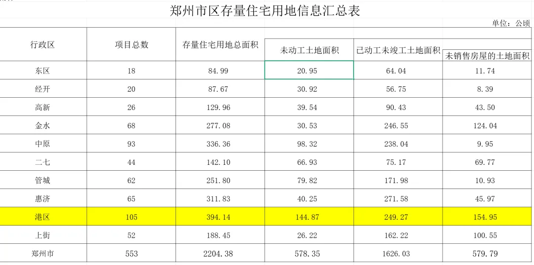 从官方数据可以明显看出,从未动工土地面积来看,港区最多为144.87公顷,其次为中原区、管城区、二七区。未动工面积最少的为东区20.95公顷。