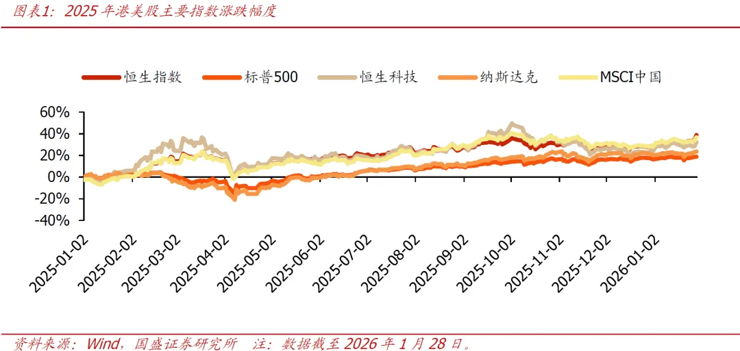 港美股1月整体上涨。截至2026年1月28日,恒生指数从2025年12月末的25631点上涨到27827点,恒生科技指数从5516点上涨到5900点,涨幅分别为8.6%、7.0%。2025年以来,恒生指数、恒生科技指数分别上涨38.7%、32.1%。