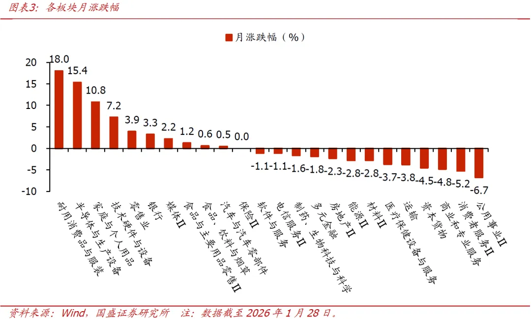 1月,耐用消费品与服装、半导体与生产设备、家庭与个人用品等行业领涨,公用事业、消费者服务、商业和专业服务等行业领跌。截至1月28日,按wind二级行业,1月耐用消费品与服装、半导体与生产设备、家庭与个人用品等板块分别上涨18.0%、15.4%、10.8%;公用事业、消费者服务、商业和专业服务等板块分别下跌6.7%、5.2%、4.8%。