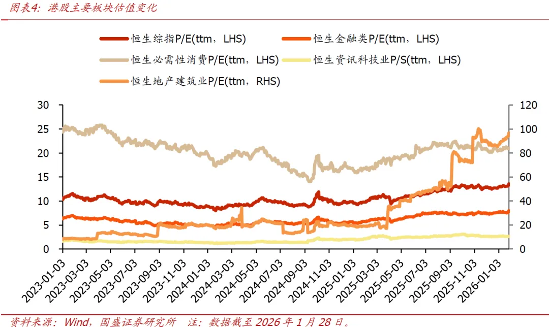 恒生综指1月的PE(TTM)上涨。截至1月28日,港股地产建筑、金融类、资讯科技、必需性消费等板块估值较12月末均有所上涨。