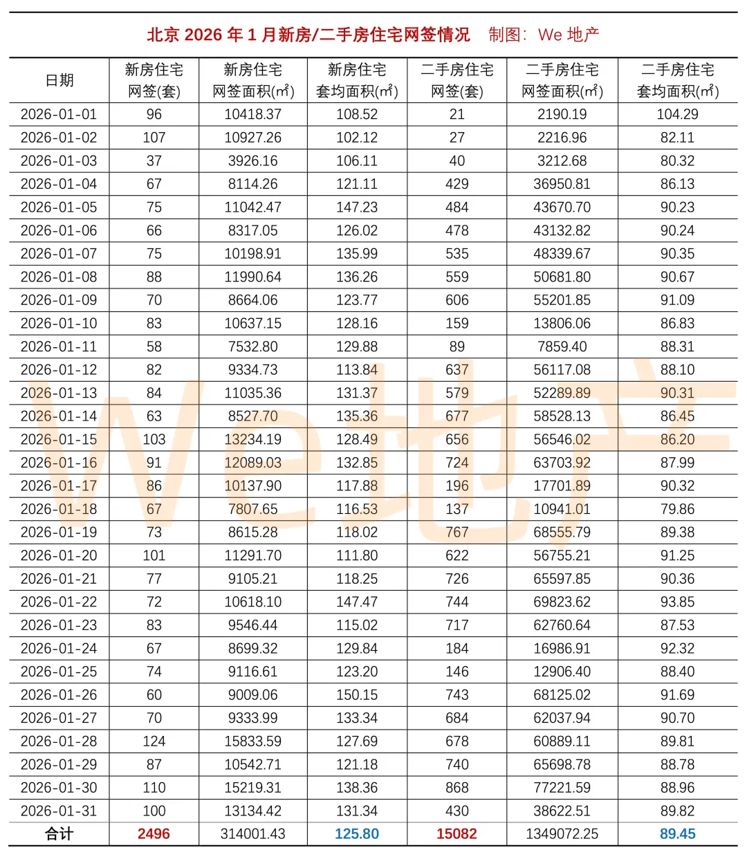 2026年1月,北京新房住宅网签2496套(期房1665套+现房831套),网签面积314001.43㎡,套均面积约125.8㎡。