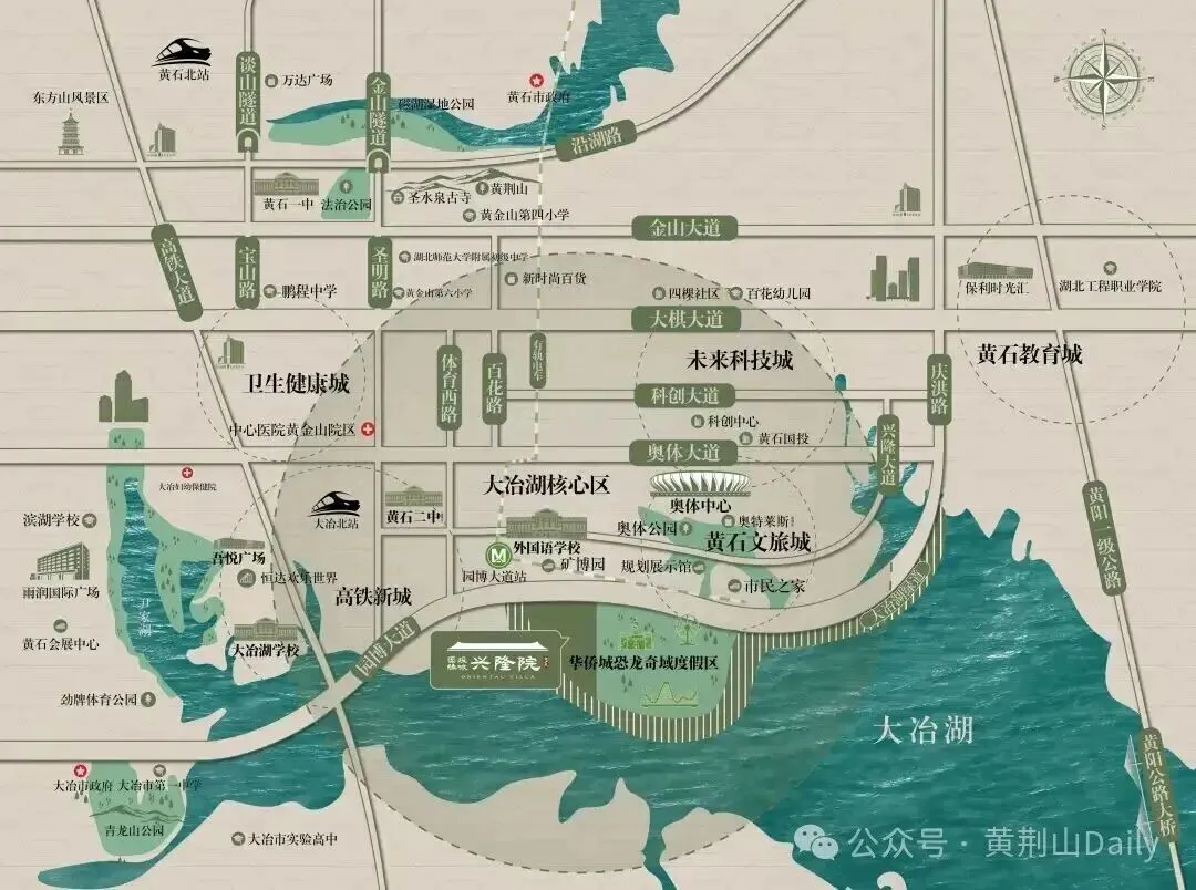 位于黄石市开发区铁山区园博大道以南,北与绿地城小区相邻,东接华侨城恐龙奇域旅游度假区,南瞰大冶湖一线湖景,地理位置优越。