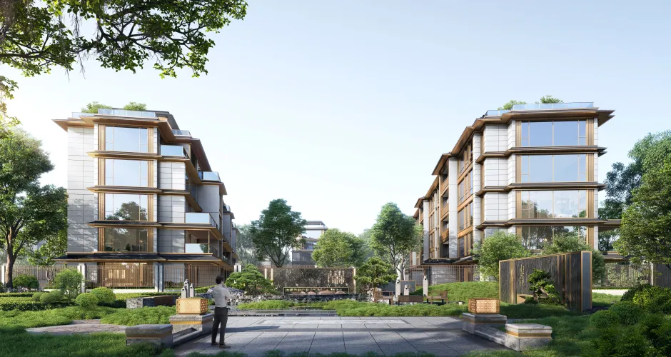 以“现代形、东方意”为核心,融合宋韵美学与现代建筑技艺,打造兼具隐逸情怀与城市生活品质的居所。建筑外观采用青瓦粉墙、叠石理水等传统元素,结合现代简约设计,营造宋韵风华的居住氛围。