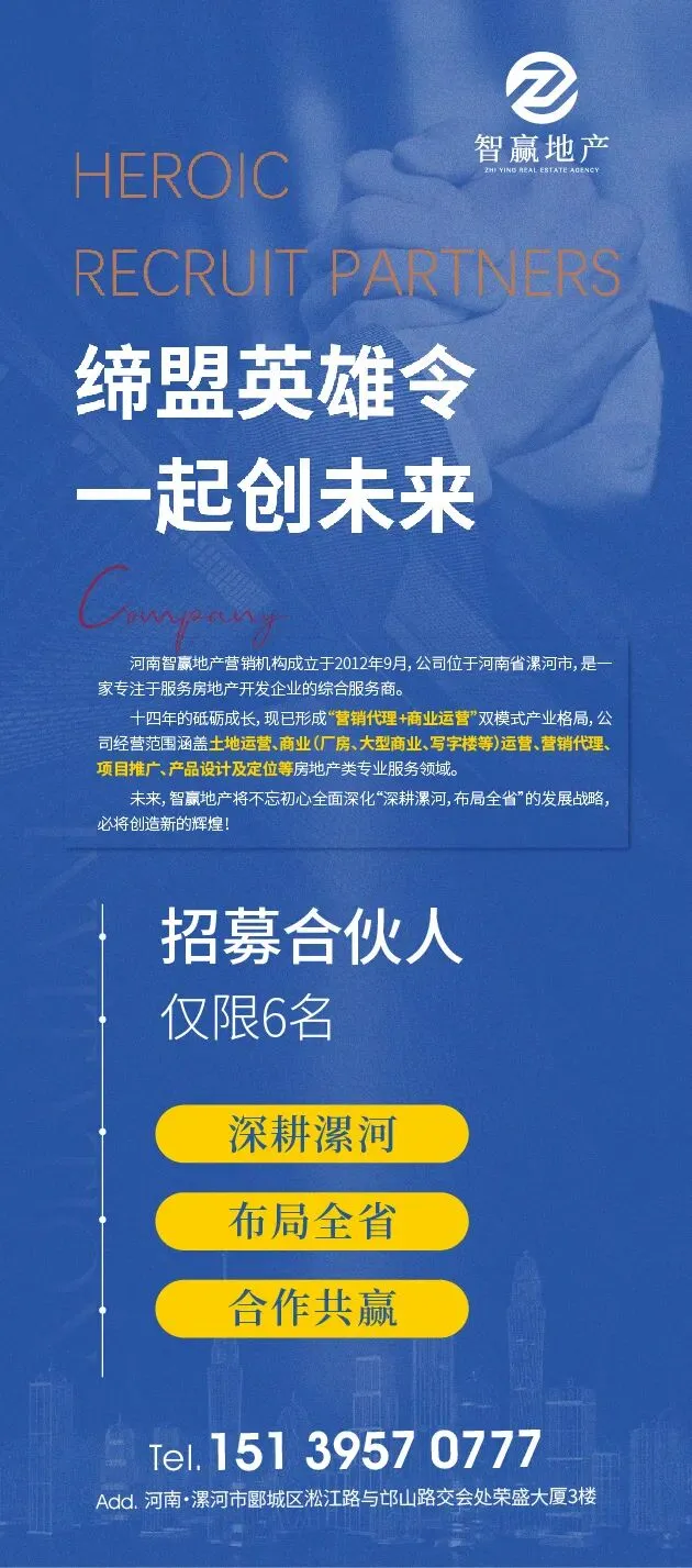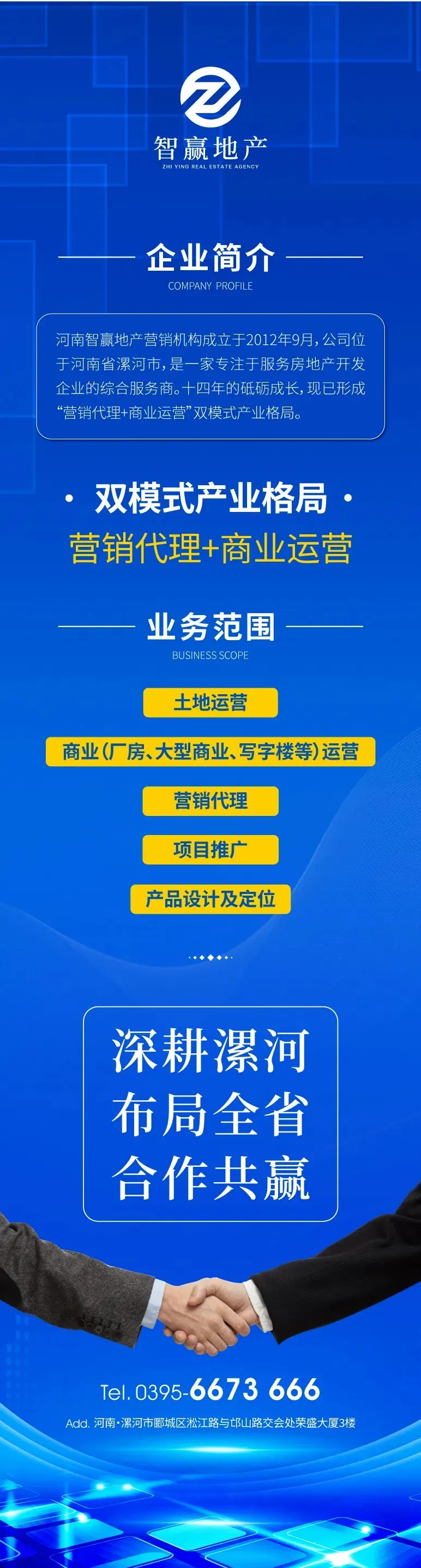 河南智赢地产营销机构成立于2012年9月,公司位于河南省漯河市,是一家专注于服务房地产开发企业的综合服务商。十四年的砥砺成长,现已形成“营销代理+商业运营”双模式产业格局,公司经营范围涵盖土地运营、商业(厂房、大型商业、写字楼等)运营、营销代理、项目推广、产品设计及定位等房地产类专业服务领域。未来,智赢地产将不忘初心全面深化“深耕漯河,布局全省”的发展战略,必将创造新的辉煌!