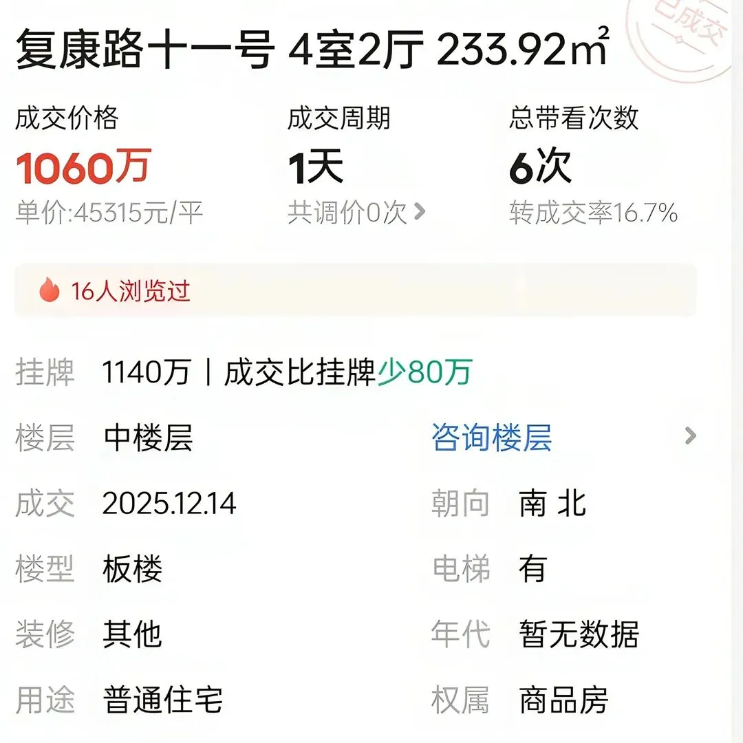复康路十一号上一套成交房源的单价还在五万二,买家看到大幅低于市场价的这套房源就果断下手了。