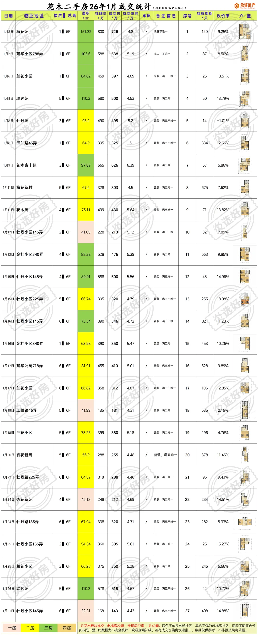 花木板块二手房市场同步发力,据不完全统计,本月共成交49套,较上月增加18套,环比大幅上涨58.06%。从过往市场规律来看,春节前通常为成交淡季,而本月花木板块逆势放量,充分印证板块市场筑底企稳态势愈发明朗。