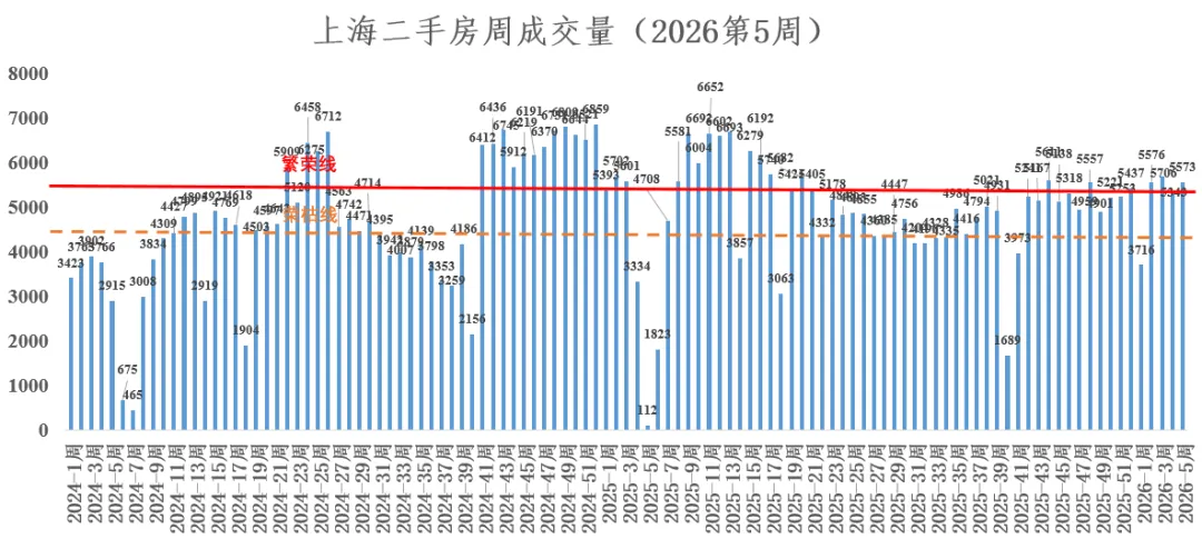 2026年第5周,上海二手房成交5573套,环比增长4.3%。本周成交量重新超过5500套,已连续第四周成交量站上5000套。