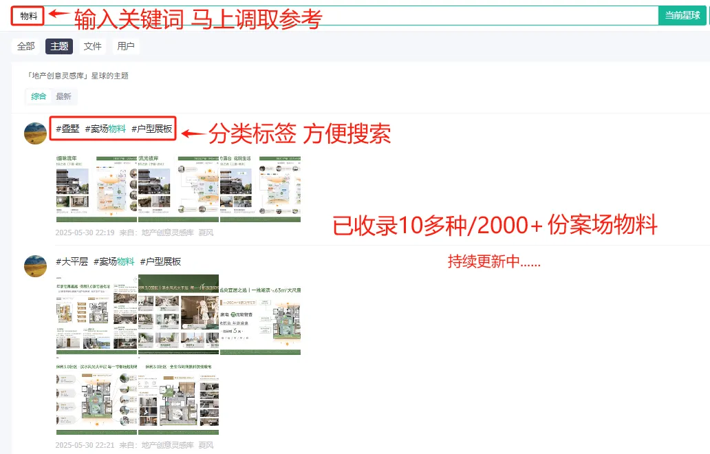 硬核内容3:销售物料库精选2000+份行业优质的案场销售物料(楼书/单页/折页/围挡/道旗/品牌墙/展板/灯箱/展架等),人工严选+实地采集+深度标签,输入关键词,3秒精准调取优秀物料案例,方便借鉴参考,快速打造无声销售利器,全面提升案场转化率!