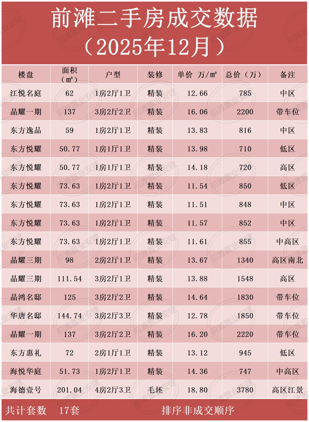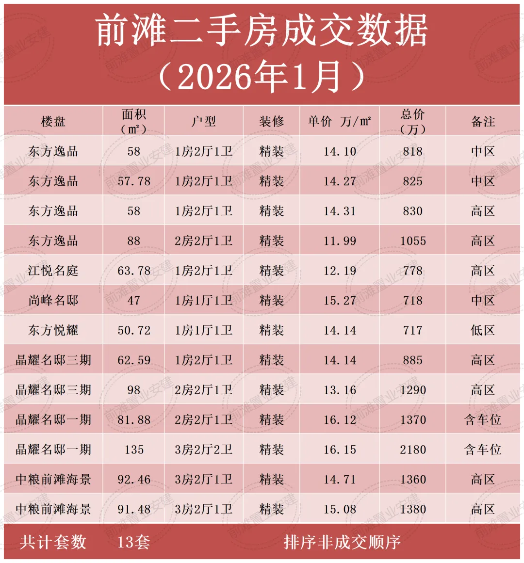 • 成交量:1月成交共计约13套,其中一居室成交7套,二居室成交3套,三居室成交3套,总体成交量较上月减少4套,呈现平稳态势,同比往年成交量属于正常水平。(不完全统计,如有误差欢迎指正)